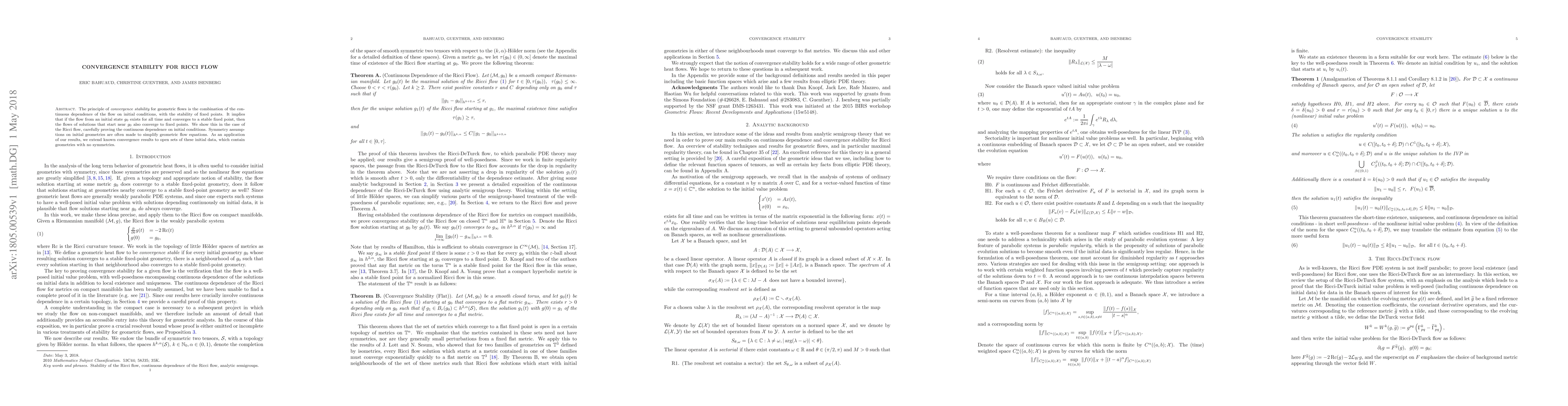 The principle of convergence stability for geometric flows is the combination of the continuous dependence of the flow on initial conditions, with the stability of fixed points. It implies that if the flow from an initial state $g_0$ exists for all time and converges to a stable fixed point, then the flows of solutions that start near $g_0$ also converge to fixed points. We show this in the case of the Ricci flow, carefully proving the continuous dependence on initial conditions. Symmetry assumptions on initial geometries are often made to simplify geometric flow equations. As an application of our results, we extend known convergence results to open sets of these initial data, which contain geometries with no symmetries.