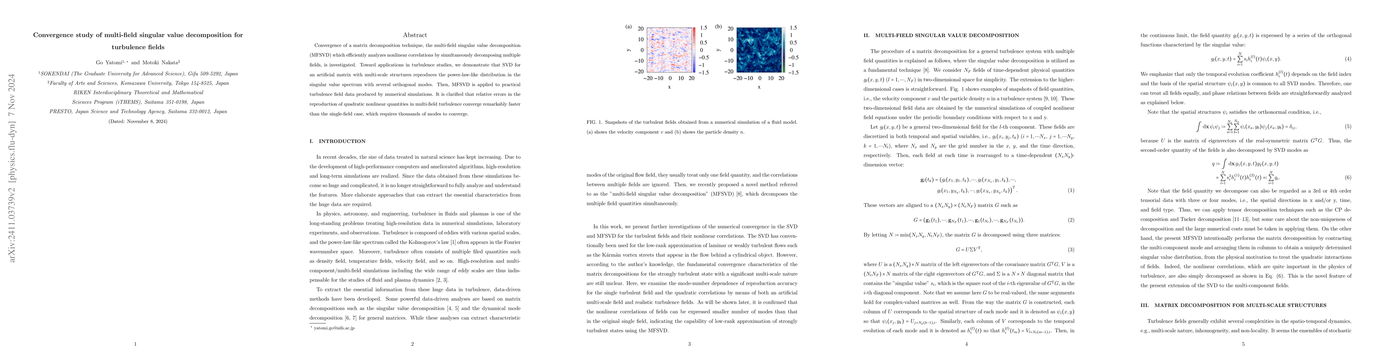 This research investigates the convergence of multi-field singular value decomposition (MFSVD) for analyzing turbulence fields, demonstrating its efficiency in reproducing power-law distributions and reducing relative errors in nonlinear turbulence analysis compared to single-field decomposition. MFSVD shows faster convergence for reproducing quadratic nonlinear quantities in turbulence simulations.