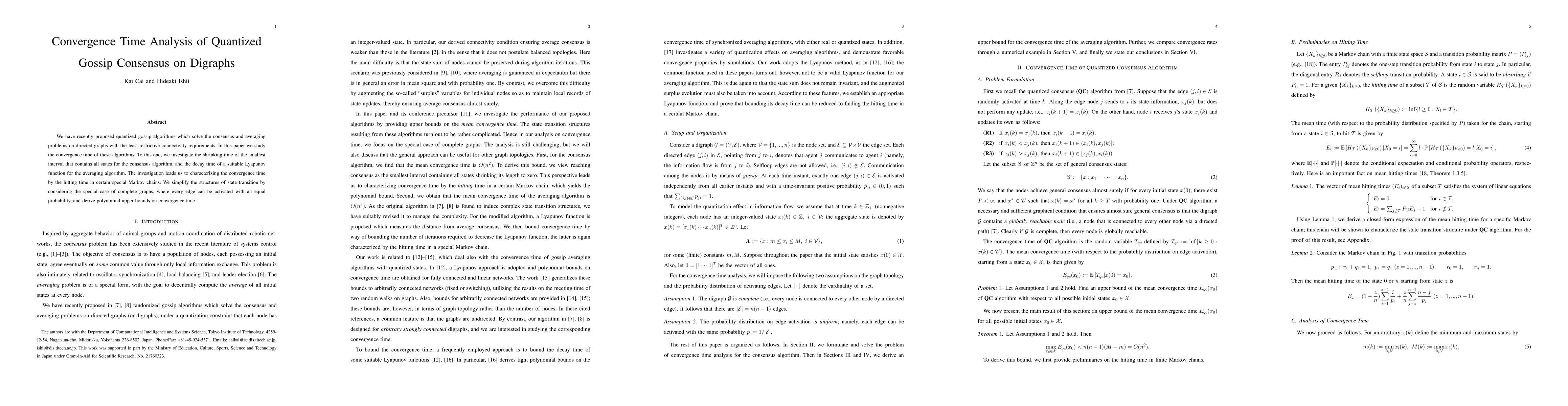 This paper analyzes the convergence time of quantized gossip algorithms for consensus and averaging on directed graphs, focusing on the shrinking interval for consensus and Lyapunov function decay for averaging. It characterizes convergence time via hitting times in Markov chains and derives polynomial upper bounds for complete graphs.