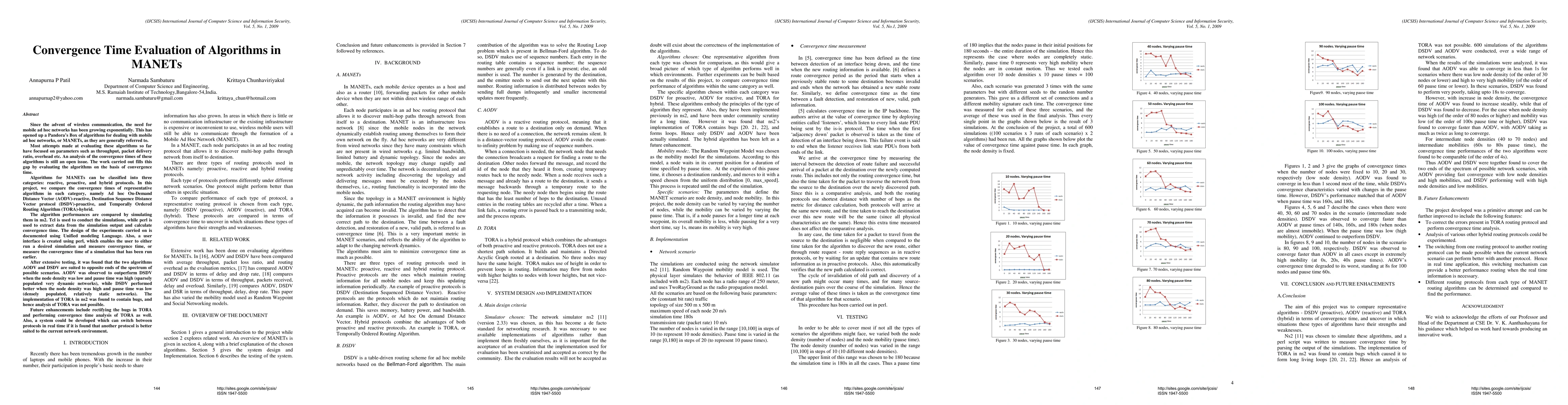 Since the advent of wireless communication, the need for mobile ad hoc networks has been growing exponentially. This has opened up a Pandoras Box of algorithms for dealing with mobile ad hoc networks, or MANETs, as they are generally referred to. Most attempts made at evaluating these algorithms so far have focused on parameters such as throughput, packet delivery ratio, overhead etc. An analysis of the convergence times of these algorithms is still an open issue. The work carried out fills this gap by evaluating the algorithms on the basis of convergence time. Algorithms for MANETs can be classified into three categories: reactive, proactive, and hybrid protocols. In this project, we compare the convergence times of representative algorithms in each category, namely Ad hoc On Demand Distance Vector (AODV) reactive, Destination Sequence Distance Vector protocol (DSDV) proactive, and Temporally Ordered Routing Algorithm (TORA) hybrid. The algorithm performances are compared by simulating them in ns2. Tcl is used to conduct the simulations, while perl is used to extract data from the simulation output and calculate convergence time. The design of the experiments carried on is documented using Unified modeling Language. Also, a user interface is created using perl, which enables the user to either run a desired simulation and measure convergence time, or measure the convergence time of a simulation that has been run earlier.