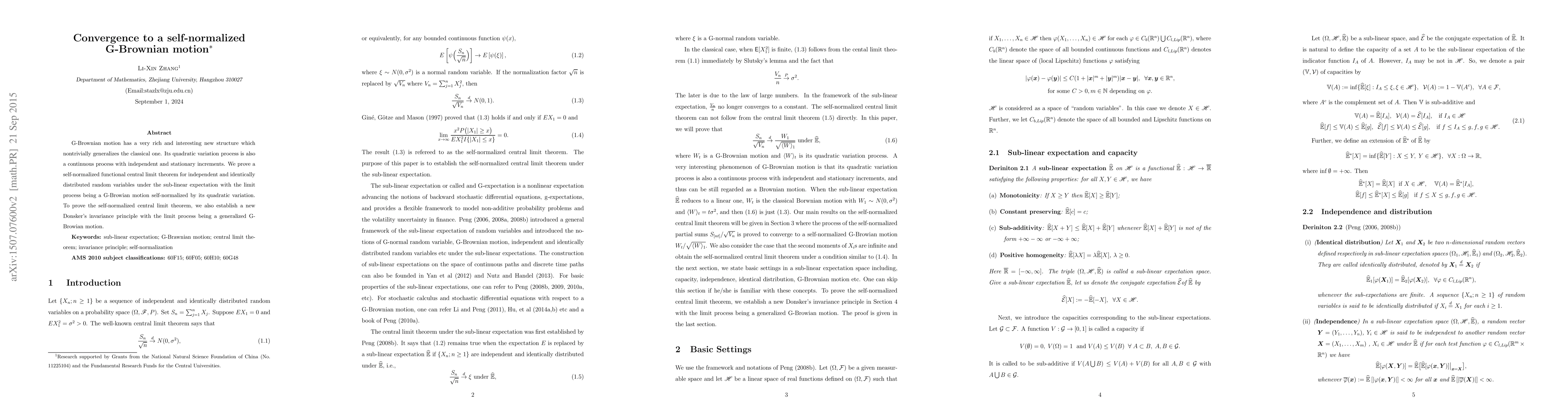 G-Brownian motion has a very rich and interesting new structure which nontrivially generalizes the classical one. Its quadratic variation process is also a continuous process with independent and stationary increments. We prove a self-normalized functional central limit theorem for independent and identically distributed random variables under the sub-linear expectation with the limit process being a G-Browian motion self-normalized by its quadratic variation. To prove the self-normalized central limit theorem, we also establish a new Donsker's invariance principle.