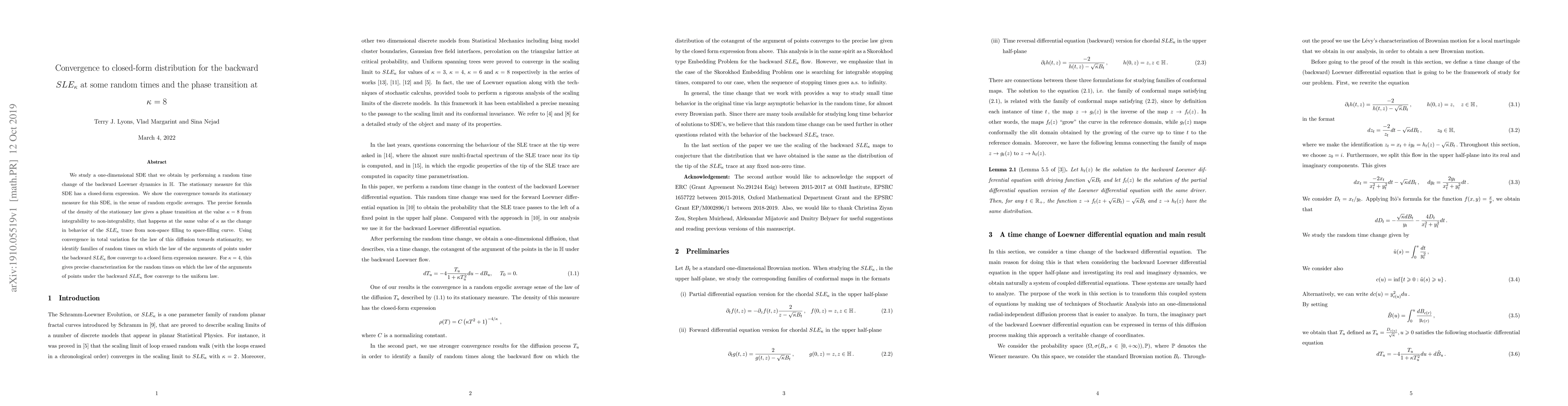 We study a one-dimensional SDE that we obtain by performing a random time change of the backward Loewner dynamics in $\mathbb{H}$. The stationary measure for this SDE has a closed-form expression. We show the convergence towards its stationary measure for this SDE, in the sense of random ergodic averages. The precise formula of the density of the stationary law gives a phase transition at the value $\kappa=8$ from integrability to non-integrability, that happens at the same value of $\kappa$ as the change in behavior of the $SLE_{\kappa}$ trace from non-space filling to space-filling curve. Using convergence in total variation for the law of this diffusion towards stationarity, we identify families of random times on which the law of the arguments of points under the backward $SLE_{\kappa}$ flow converge to a closed form expression measure. For $\kappa=4,$ this gives precise characterization for the random times on which the law of the arguments of points under the backward $SLE_{\kappa}$ flow converge to the uniform law.