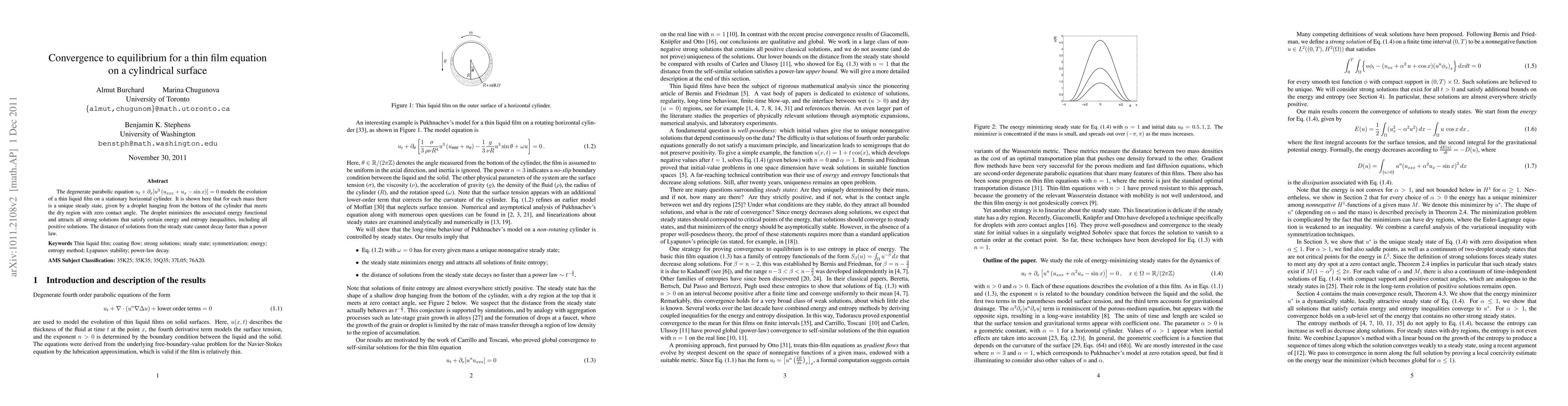 The degenerate parabolic equation u_t + [u^3(u_xxx + u_x - sin x)]_x=0 models the evolution of a thin liquid film on a stationary horizontal cylinder. It is shown here that for each given mass there is a unique steady state, given by a droplet hanging from the bottom of the cylinder that meets the dry region at the top with zero contact angle. The droplet minimizes the energy and attracts all strong solutions that satisfy certain energy and entropy inequalities. The distance of any solution from the steady state decays no faster than a power law.