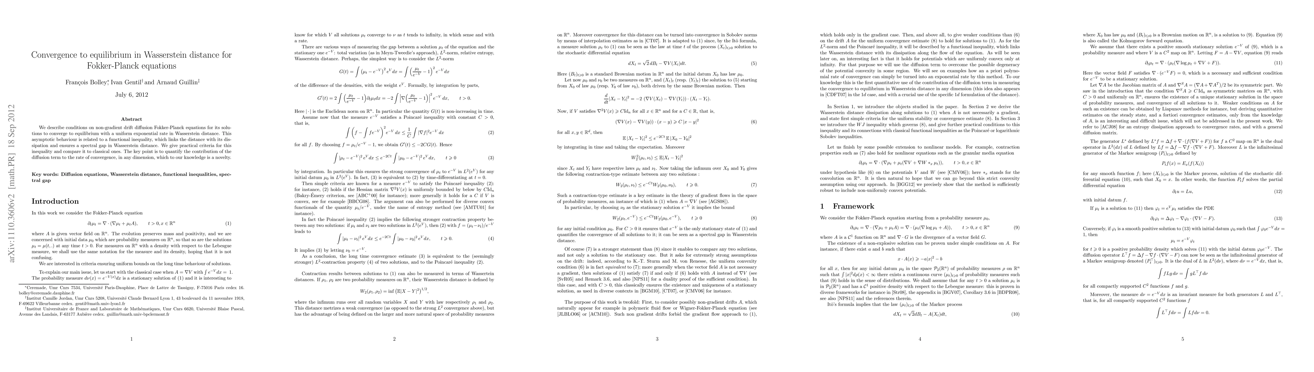 This paper establishes conditions for non-gradient drift diffusion Fokker-Planck equations to converge to equilibrium with a uniform exponential rate in Wasserstein distance, linking this behavior to a functional inequality that ensures a spectral gap. It introduces novel criteria to quantify the diffusion term's contribution to the convergence rate.