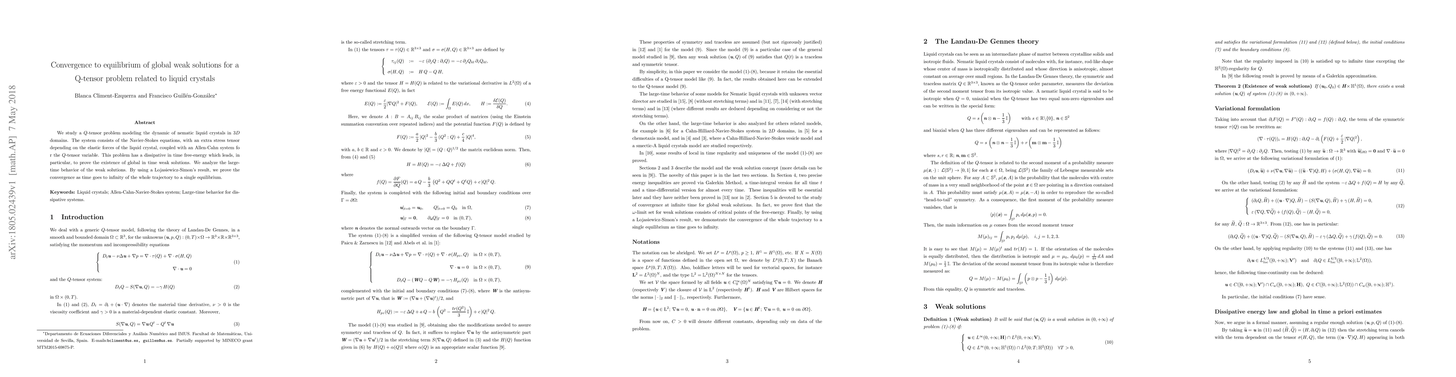 This paper investigates the dynamic behavior of nematic liquid crystals modeled by a Q-tensor problem, combining Navier-Stokes and Allen-Cahn equations. It proves the existence of global weak solutions and demonstrates their convergence to a single equilibrium state over time.