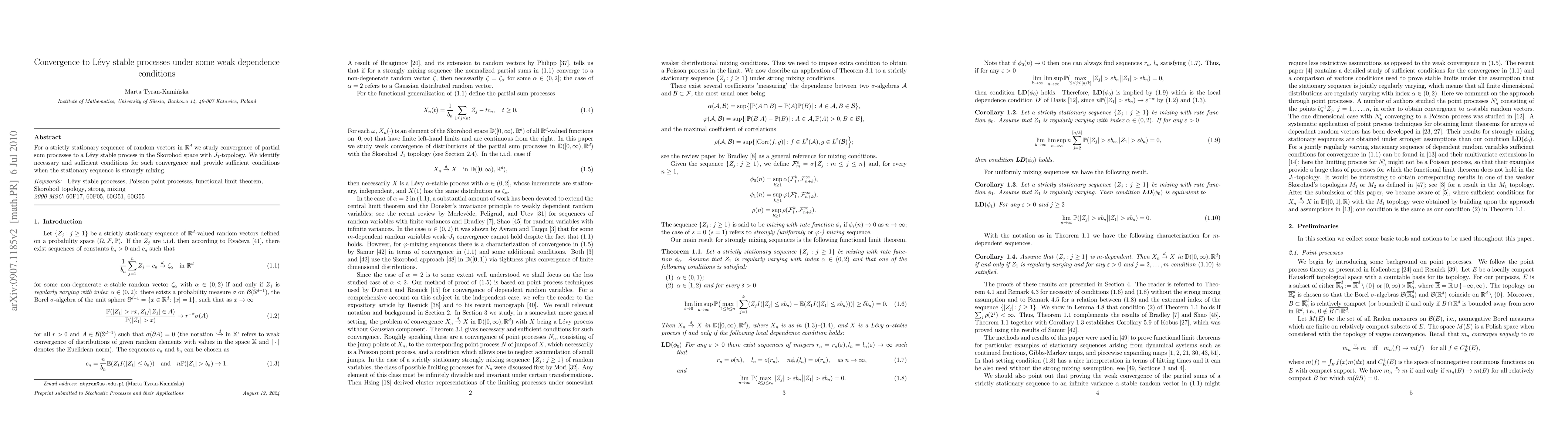 For a strictly stationary sequence of random vectors in $\mathbb{R}^d$ we study convergence of partial sum processes to L\'evy stable process in the Skorohod space with $J_1$-topology. We identify necessary and sufficient conditions for such convergence and provide sufficient conditions when the stationary sequence is strongly mixing.