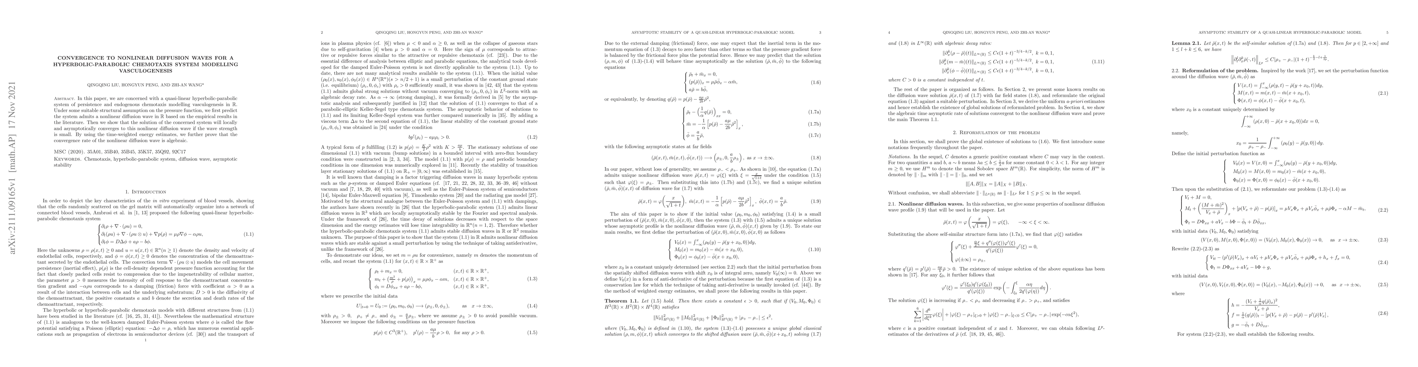 This paper studies a quasi-linear hyperbolic-parabolic system modeling vasculogenesis, showing that under certain conditions, solutions converge to a nonlinear diffusion wave. The convergence rate is proven to be algebraic using time-weighted energy estimates.
