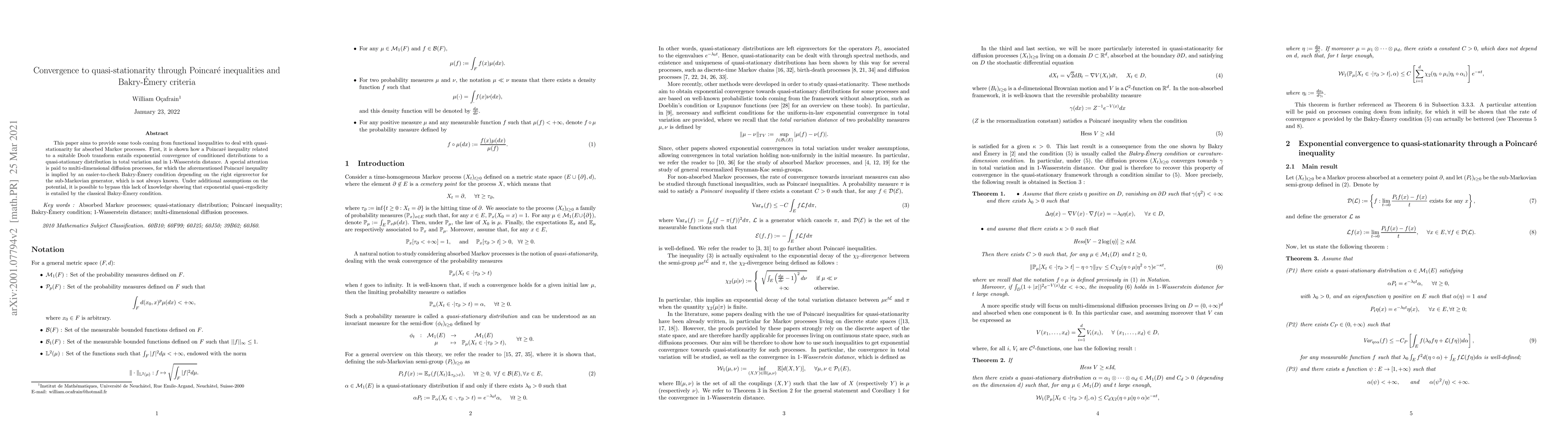 This paper uses functional inequalities and Bakry-Émery criteria to establish quasi-stationarity for absorbed Markov processes, demonstrating exponential convergence to quasi-stationary distributions via a Poincaré inequality linked to a Doob transform. The study also shows that a Bakry-Émery condition can imply the Poincaré inequality for multi-dimensional diffusion processes, facilitating analysis even when the sub-Markovian generator's right eigenvector is unknown.