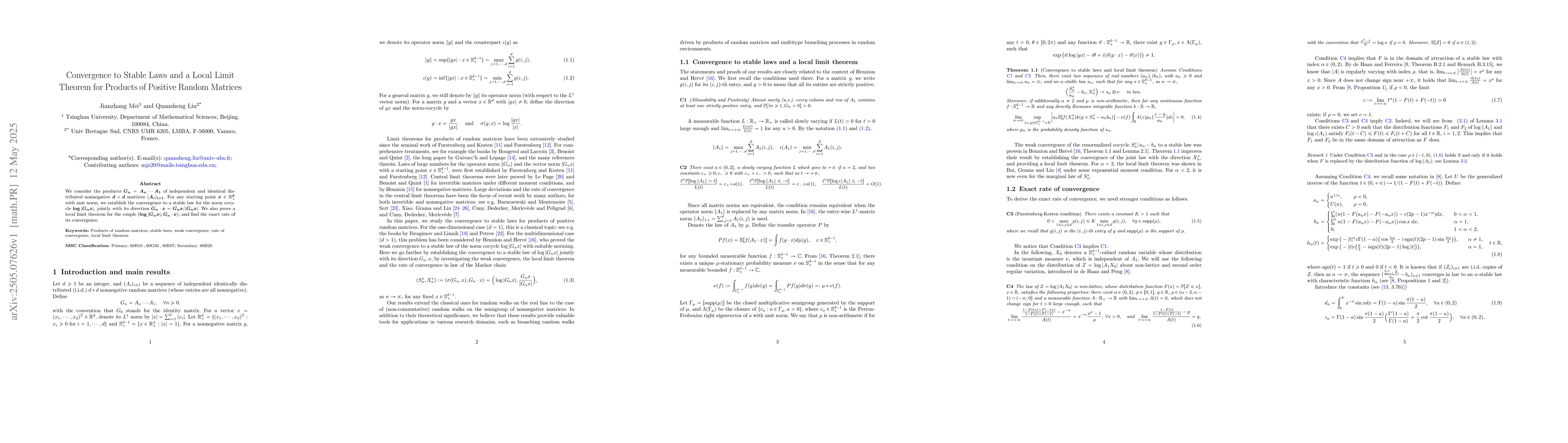 The paper presents a detailed analysis of norm cocycles and stable laws for products of positive random matrices, along with a local limit theorem.