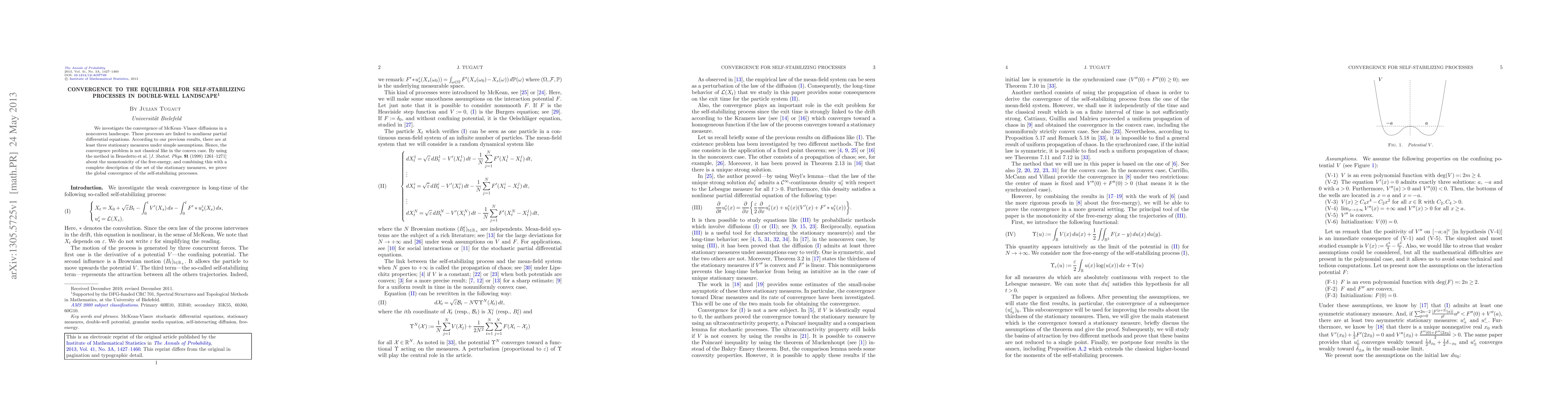 We investigate the convergence of McKean-Vlasov diffusions in a nonconvex landscape. These processes are linked to nonlinear partial differential equations. According to our previous results, there are at least three stationary measures under simple assumptions. Hence, the convergence problem is not classical like in the convex case. By using the method in Benedetto et al. [J. Statist. Phys. 91 (1998) 1261-1271] about the monotonicity of the free-energy, and combining this with a complete description of the set of the stationary measures, we prove the global convergence of the self-stabilizing processes.