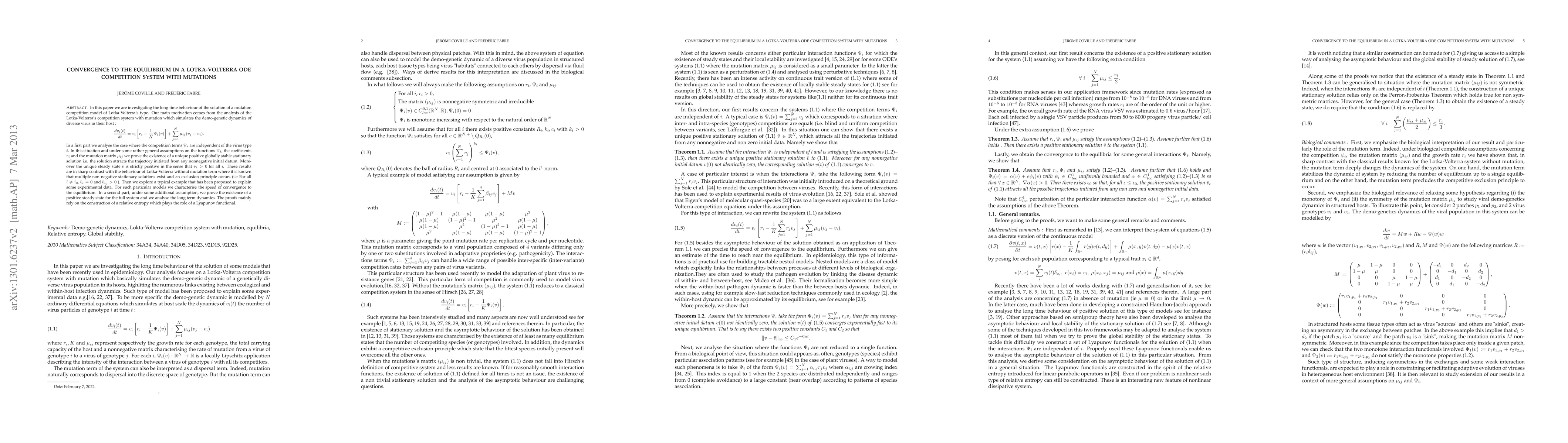 In this paper we are investigating the long time behaviour of the solution of a mutation competition model of Lotka-Volterra's type. Our main motivation comes from the analysis of the Lotka-Volterra's competition system with mutation which simulates the demo-genetic dynamics of diverse virus in their host : $$ \frac{dv_{i}(t)}{dt}=v_i\[r_i-\frac{1}{K}\Psi_i(v)\]+\sum_{j=1}^{N} \mu_{ij}(v_j-v_i). $$ In a first part we analyse the case where the competition terms $\Psi_i$ are independent of the virus type $i$. In this situation and under some rather general assumptions on the functions $\Psi_i$, the coefficients $r_i$ and the mutation matrix $\mu_{ij}$ we prove the existence of a unique positive globally stable stationary solution i.e. the solution attracts the trajectory initiated from any nonnegative initial datum. Moreover the unique steady state $\bar v$ is strictly positive in the sense that $\bar v_i>0$ for all $i$. These results are in sharp contrast with the behaviour of Lotka-Volterra without mutation term where it is known that multiple non negative stationary solutions exist and an exclusion principle occurs (i.e For all $i\neq i_0, \bar v_{i}=0$ and $\bar v_{i_0}>0$). Then we explore a typical example that has been proposed to explain some experimental data. For such particular models we characterise the speed of convergence to the equilibrium. In a second part, under some additional assumption, we prove the existence of a positive steady state for the full system and we analyse the long term dynamics. The proofs mainly rely on the construction of a relative entropy which plays the role of a Lyapunov functional.