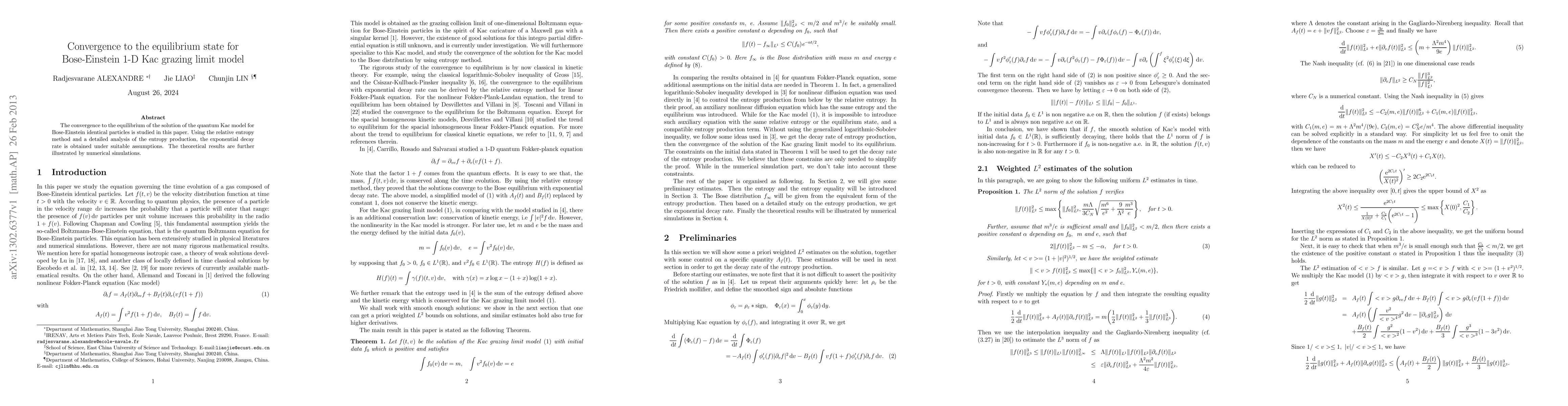 This paper investigates the convergence to equilibrium of the quantum Kac model for Bose-Einstein particles, deriving an exponential decay rate using the relative entropy method and entropy production analysis. Numerical simulations support the theoretical findings.