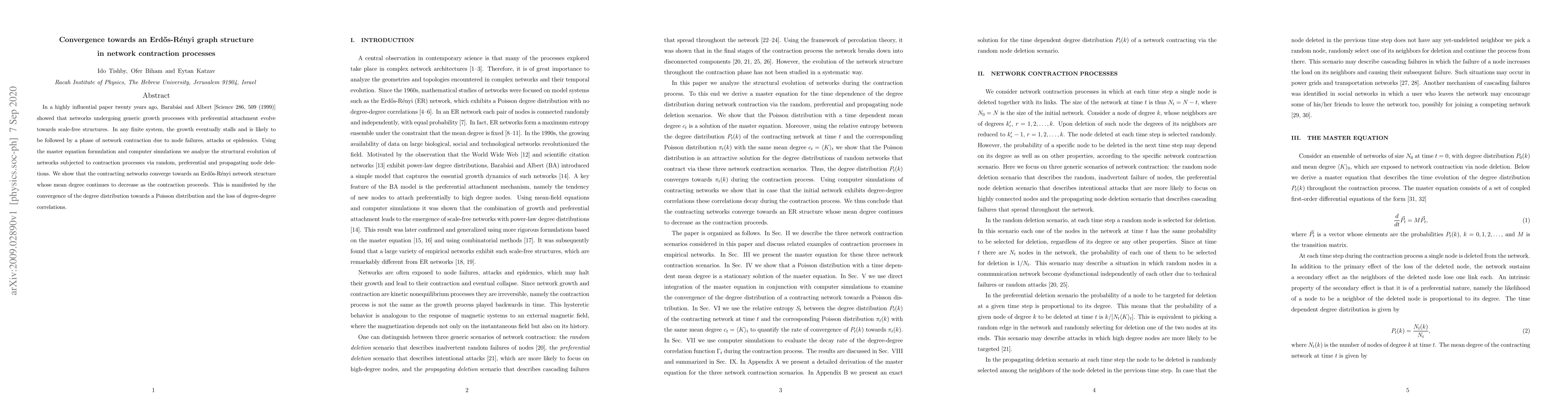 In a highly influential paper twenty years ago, Barab\'asi and Albert [Science 286, 509 (1999)] showed that networks undergoing generic growth processes with preferential attachment evolve towards scale-free structures. In any finite system, the growth eventually stalls and is likely to be followed by a phase of network contraction due to node failures, attacks or epidemics. Using the master equation formulation and computer simulations we analyze the structural evolution of networks subjected to contraction processes via random, preferential and propagating node deletions. We show that the contracting networks converge towards an Erd{\H o}s-R\'enyi network structure whose mean degree continues to decrease as the contraction proceeds. This is manifested by the convergence of the degree distribution towards a Poisson distribution and the loss of degree-degree correlations.