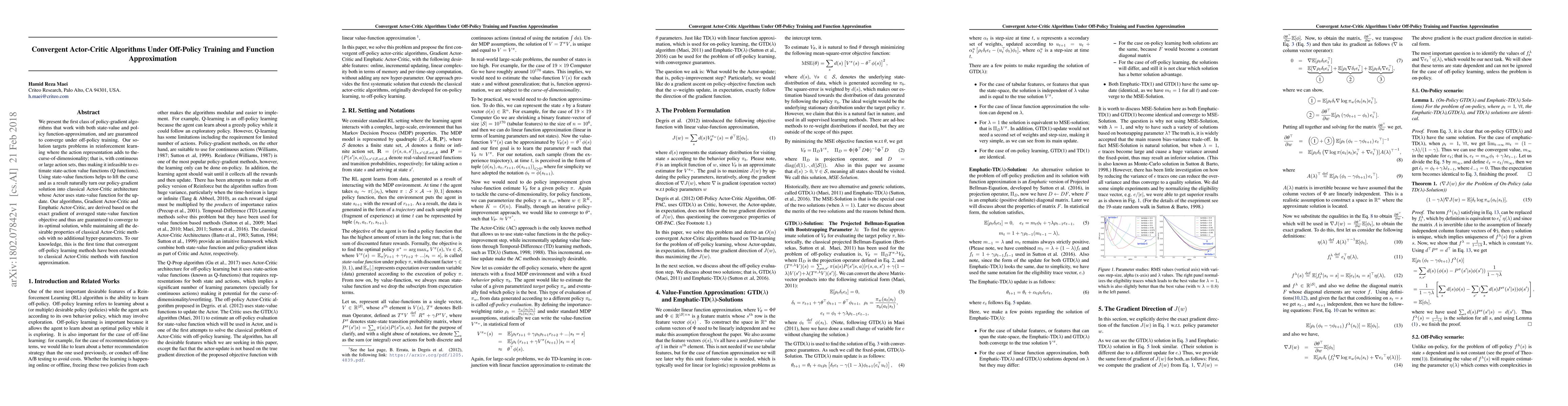 This paper introduces a new class of policy-gradient algorithms, Gradient Actor-Critic and Emphatic Actor-Critic, that converge under off-policy training and function approximation, addressing the curse of dimensionality in reinforcement learning with large or continuous action spaces. These algorithms leverage state-value functions to achieve convergence without additional hyperparameters.