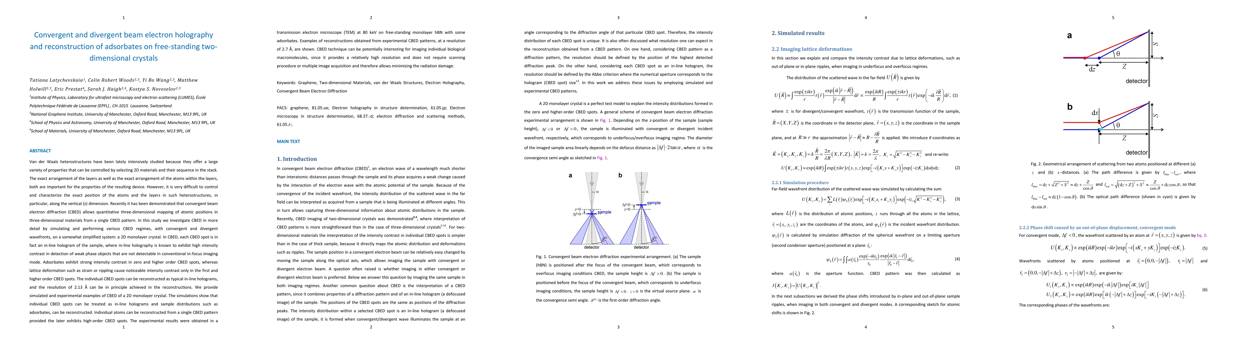 This paper investigates the use of convergent beam electron diffraction (CBED) for reconstructing adsorbates on free-standing 2D crystals, demonstrating that CBED spots act as in-line holograms, allowing high-resolution detection and reconstruction of atomic arrangements, including adsorbates, at resolutions up to 2.7 Å.