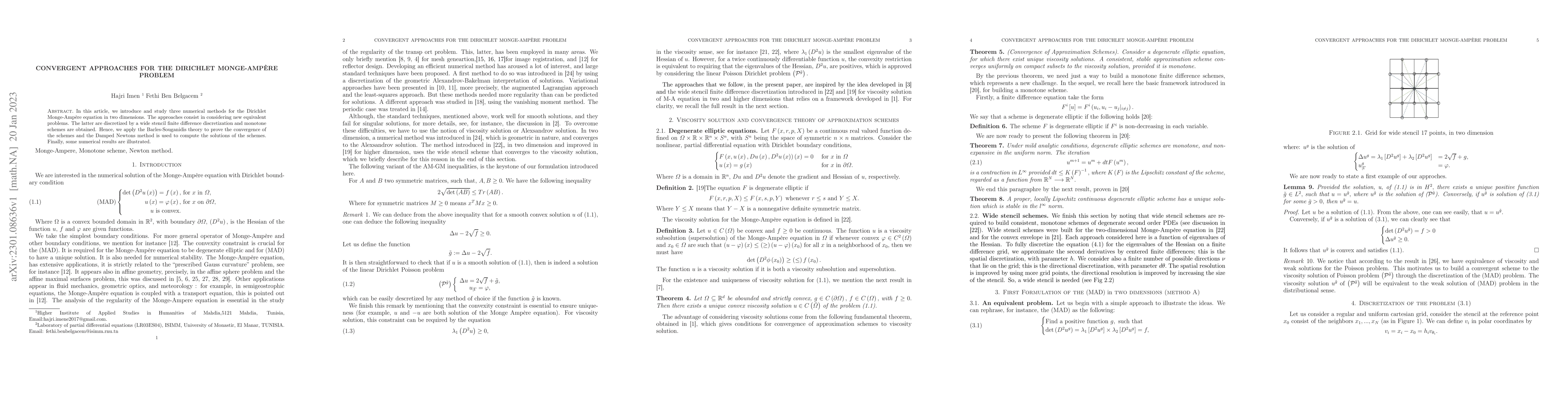 This paper presents three numerical methods for solving the Dirichlet Monge Ampère equation in two dimensions, utilizing equivalent problem formulations, finite difference discretization, and monotone schemes. The Barles-Souganidis theory is employed to prove the convergence of these methods, with the Damped Newton method used for computation, followed by numerical results demonstrating their effectiveness.