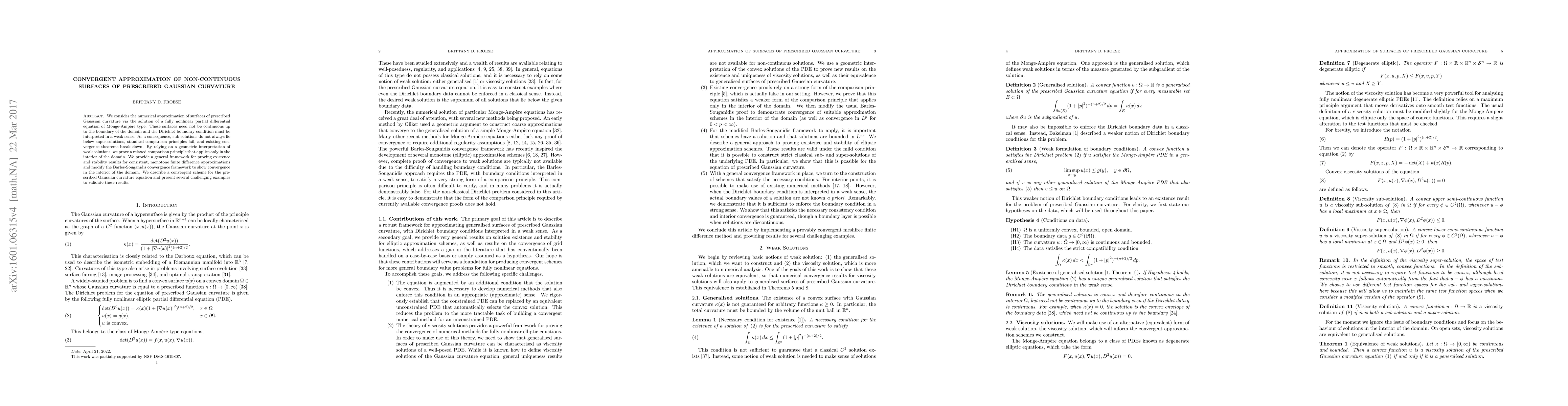 We consider the numerical approximation of surfaces of prescribed Gaussian curvature via the solution of a fully nonlinear partial differential equation of Monge-Amp\`ere type. These surfaces need not be continuous up to the boundary of the domain and the Dirichlet boundary condition must be interpreted in a weak sense. As a consequence, sub-solutions do not always lie below super-solutions, standard comparison principles fail, and existing convergence theorems break down. By relying on a geometric interpretation of weak solutions, we prove a relaxed comparison principle that applies only in the interior of the domain. We provide a general framework for proving existence and stability results for consistent, monotone finite difference approximations and modify the Barles-Souganidis convergence framework to show convergence in the interior of the domain. We describe a convergent scheme for the prescribed Gaussian curvature equation and present several challenging examples to validate these results.