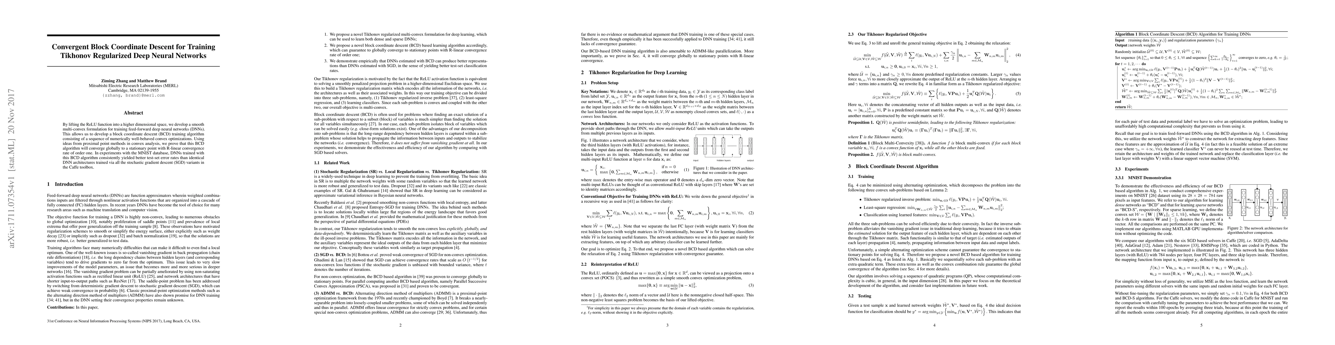 This paper proposes a convergent block coordinate descent (BCD) algorithm for training Tikhonov regularized deep neural networks by lifting the ReLU function into a higher dimensional space, resulting in a smooth multi-convex formulation. The BCD algorithm demonstrates global convergence to a stationary point and outperforms stochastic gradient descent (SGD) in terms of test-set error rates on the MNIST dataset.
