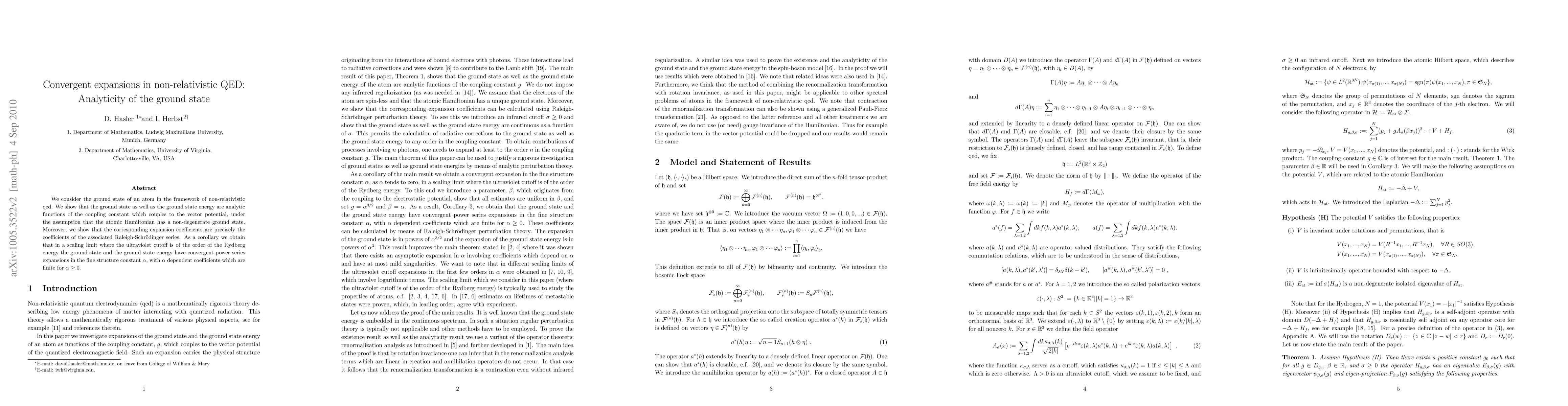 This paper demonstrates that the ground state and its energy in non-relativistic quantum electrodynamics (QED) are analytic functions of the coupling constant, with convergent power series expansions in the fine structure constant $\alpha$. The expansion coefficients match the Raleigh-Schroedinger series.