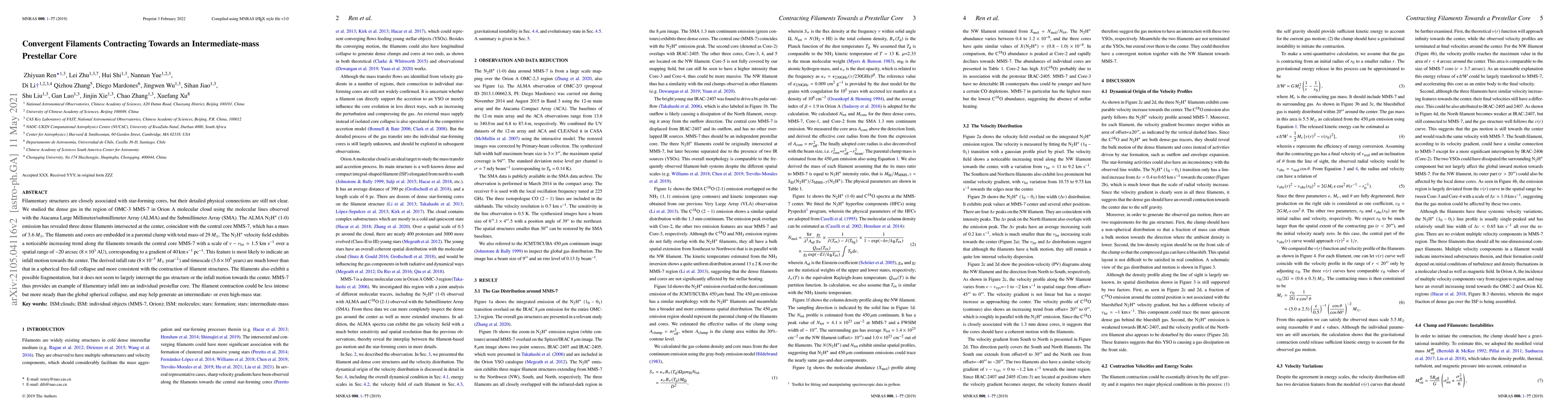 This study using ALMA and SMA observations reveals that three dense filaments in the OMC-3 MMS-7 region of Orion A are converging towards an intermediate-mass prestellar core, indicating a steady infall motion rather than a rapid spherical collapse. The observed infall rate and timescale suggest filamentary contraction may facilitate the formation of intermediate-mass stars.