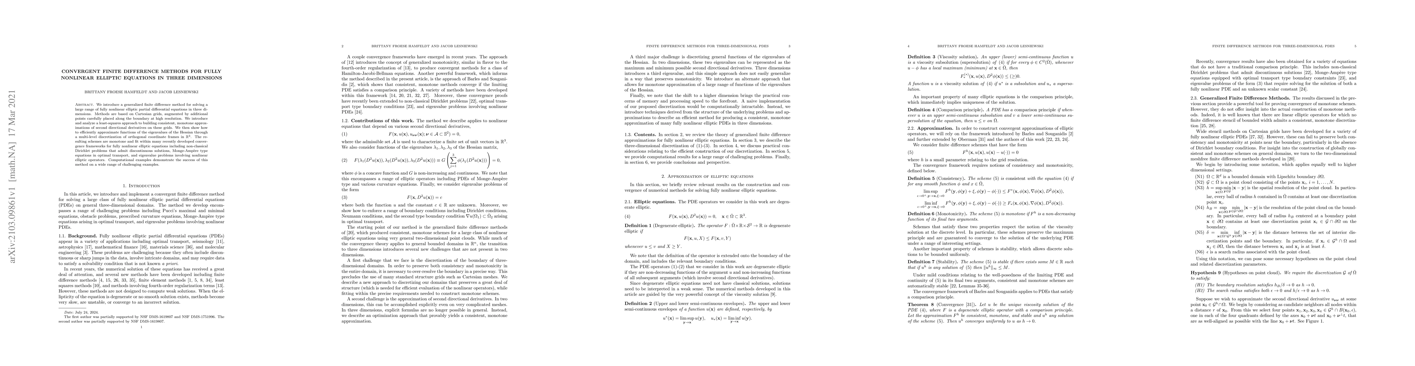 The paper introduces a generalized finite difference method for solving fully nonlinear elliptic PDEs in three dimensions using Cartesian grids with additional boundary points for high resolution. It employs a least-squares approach for consistent, monotone approximations of second directional derivatives and a multi-level discretization for approximating functions of Hessian eigenvalues.