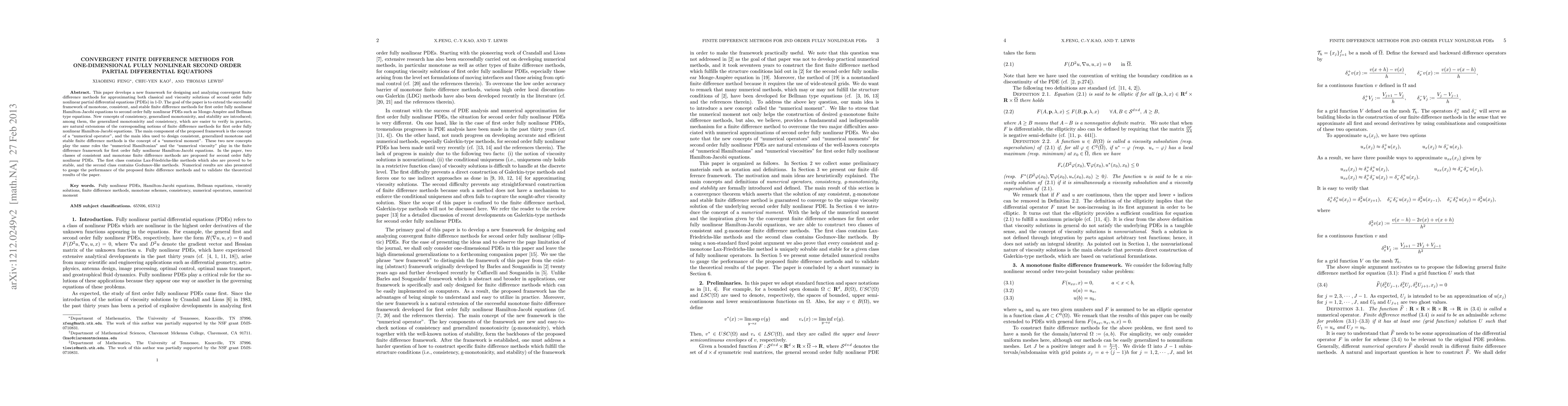 This paper introduces a new framework for developing convergent finite difference methods for one-dimensional second-order fully nonlinear PDEs, extending existing methods for first-order equations. It proposes two classes of consistent, monotone, and stable finite difference methods, including Lax-Friedrichs-like and Godunov-like methods, validated through numerical results.
