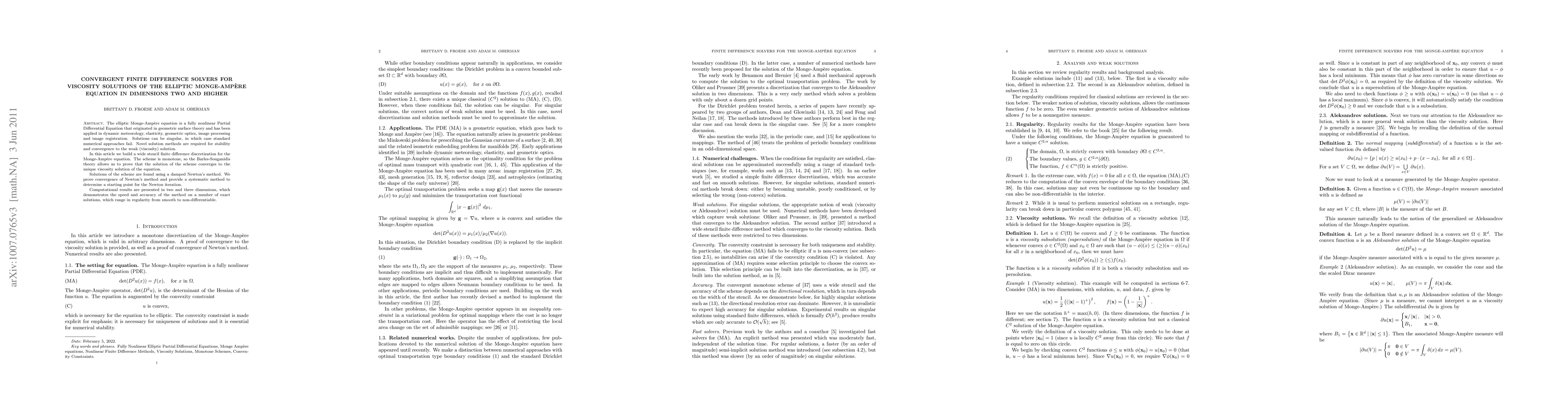 The elliptic Monge-Amp\`ere equation is a fully nonlinear Partial Differential Equation that originated in geometric surface theory and has been applied in dynamic meteorology, elasticity, geometric optics, image processing and image registration. Solutions can be singular, in which case standard numerical approaches fail. Novel solution methods are required for stability and convergence to the weak (viscosity) solution. In this article we build a wide stencil finite difference discretization for the \MA equation. The scheme is monotone, so the Barles-Souganidis theory allows us to prove that the solution of the scheme converges to the unique viscosity solution of the equation. Solutions of the scheme are found using a damped Newton's method. We prove convergence of Newton's method and provide a systematic method to determine a starting point for the Newton iteration. Computational results are presented in two and three dimensions, which demonstrates the speed and accuracy of the method on a number of exact solutions, which range in regularity from smooth to non-differentiable.