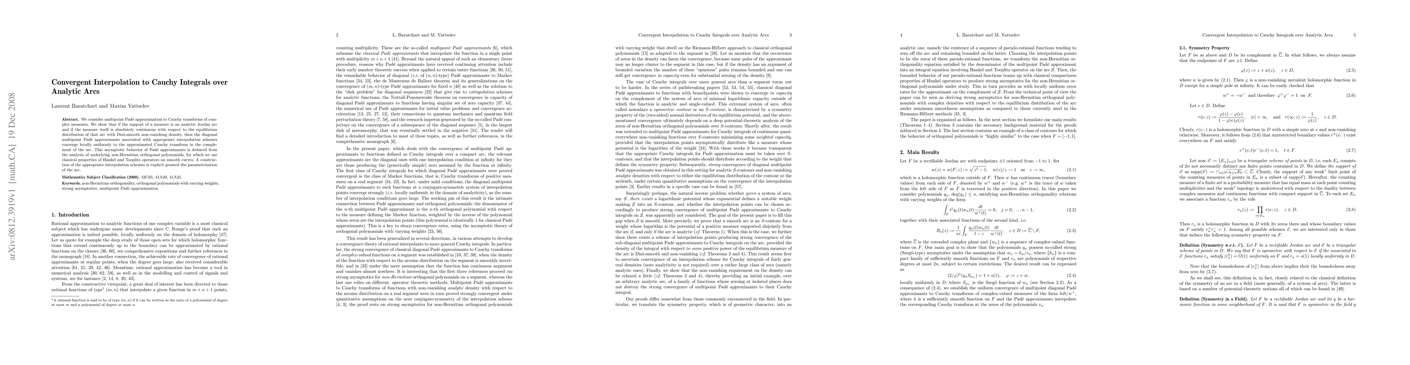 This paper explores the convergence of multipoint Padé approximants to Cauchy transforms of complex measures supported on analytic Jordan arcs. It demonstrates that under certain conditions, these approximants converge uniformly to the Cauchy transform in the complement of the arc, leveraging properties of non-Hermitian orthogonal polynomials and classical results from Hankel and Toeplitz operators.
