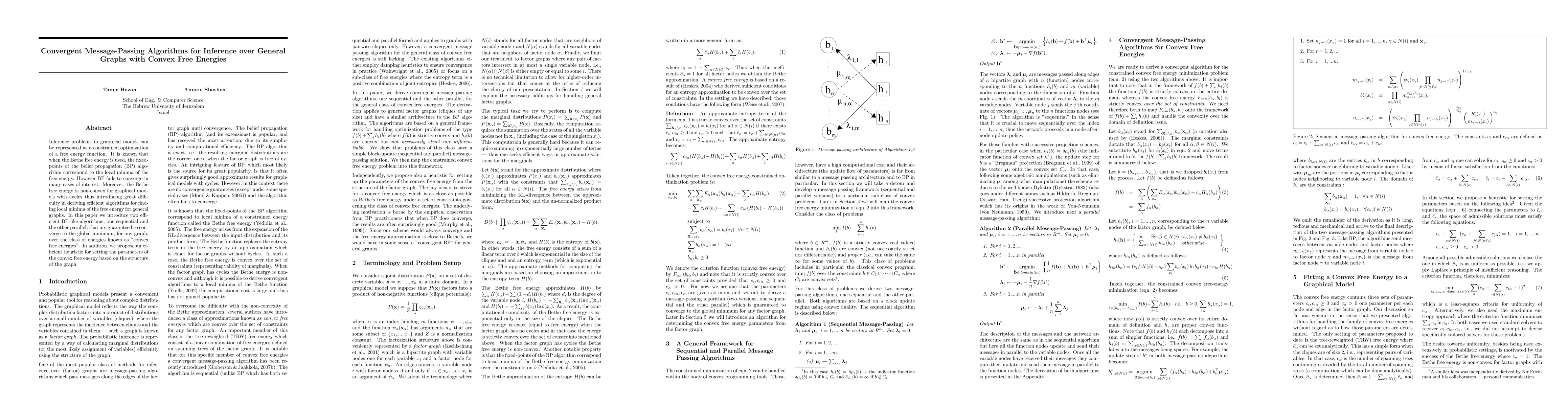 This paper introduces two convergent message-passing algorithms—sequential and parallel—that guarantee convergence to the global minimum for inference problems over general graphs with convex free energies, addressing the limitations of traditional belief propagation in non-convex scenarios. It also proposes a heuristic for setting parameters based on graph structure.