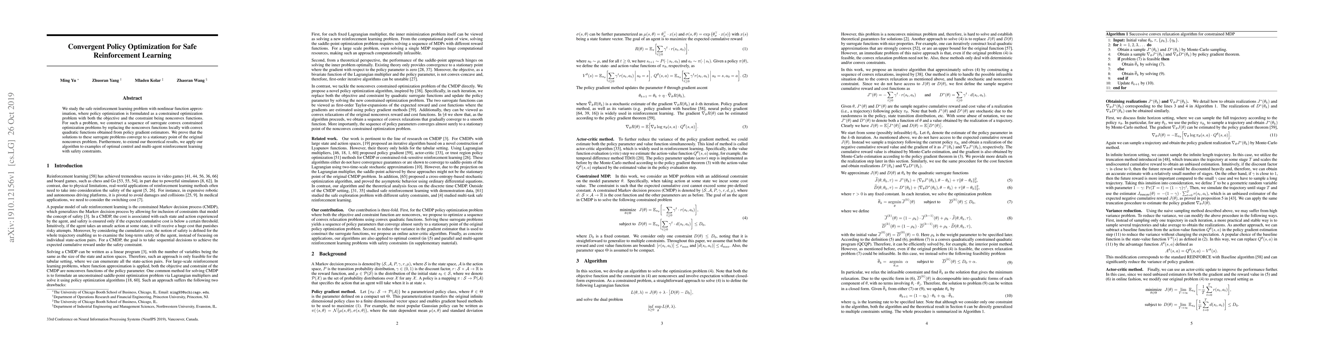 This paper proposes a method for safe reinforcement learning using convergent policy optimization, transforming nonconvex problems into a sequence of convex surrogate problems. The authors prove the convergence of solutions to the original nonconvex problem and demonstrate the effectiveness through optimal control and multi-agent scenarios.