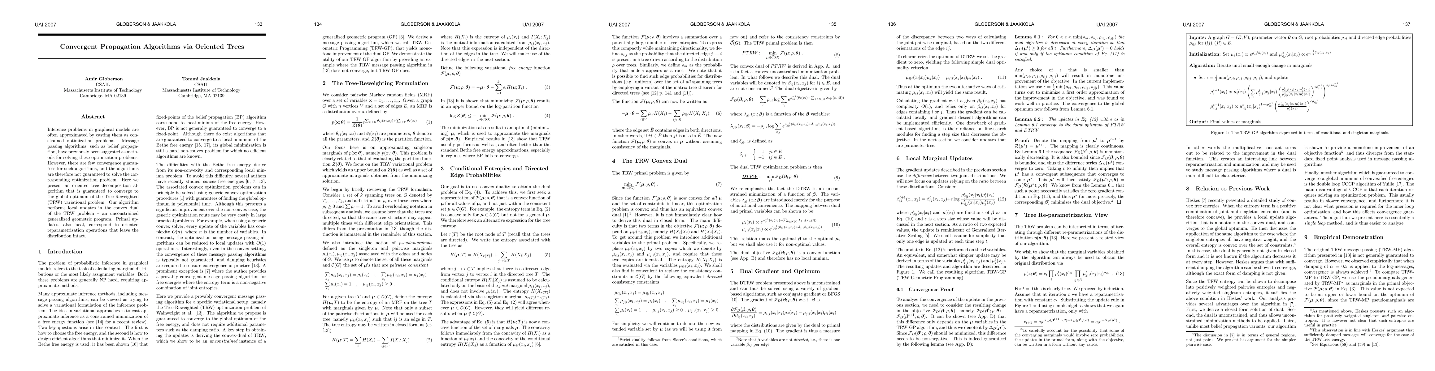 Inference problems in graphical models are often approximated by casting them as constrained optimization problems. Message passing algorithms, such as belief propagation, have previously been suggested as methods for solving these optimization problems. However, there are few convergence guarantees for such algorithms, and the algorithms are therefore not guaranteed to solve the corresponding optimization problem. Here we present an oriented tree decomposition algorithm that is guaranteed to converge to the global optimum of the Tree-Reweighted (TRW) variational problem. Our algorithm performs local updates in the convex dual of the TRW problem - an unconstrained generalized geometric program. Primal updates, also local, correspond to oriented reparametrization operations that leave the distribution intact.