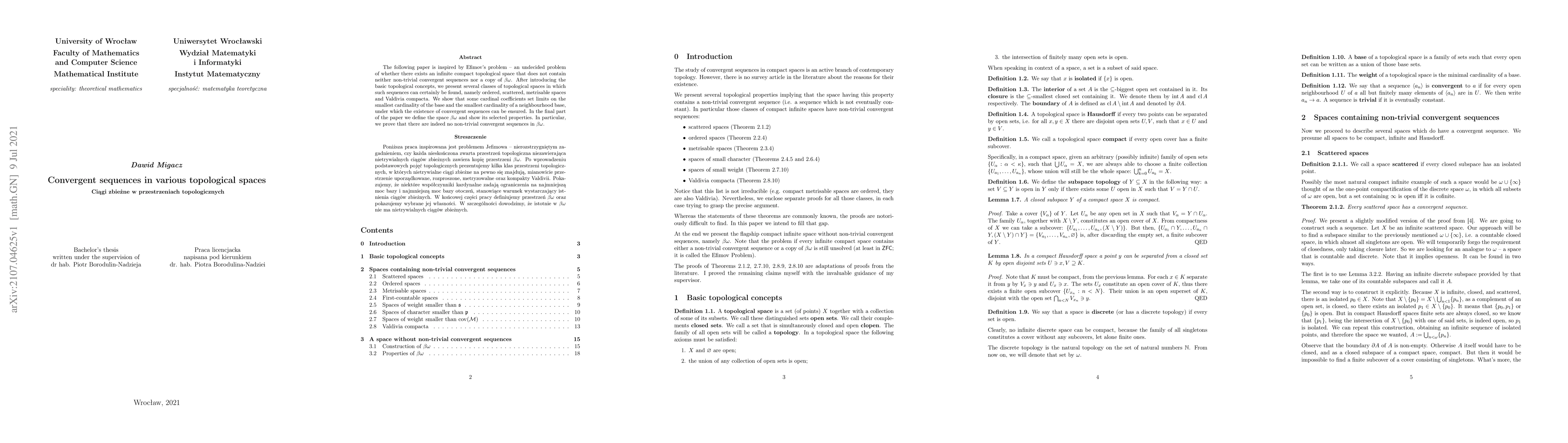 The following paper is inspired by Efimov's problem - an undecided problem of whether there exists an infinite compact topological space that does not contain neither non-trivial convergent sequences nor a copy of $\beta\omega$. After introducing basic topological concepts, we present several classes of topological spaces in which such sequences can certainly be found, namely ordered, scattered, metrisable spaces and Valdivia compacta. We show that some cardinal coefficients set limits on the smallest cardinality of the base and the smallest cardinality of a neighbourhood base, under which the existence of convergent sequences can be ensured. In the final part of the paper we define the space $\beta\omega$ and show its selected properties. In particular, we prove that there are indeed no non-trivial convergent sequences in $\beta\omega$. Whereas the statements of these theorems are commonly known, the proofs are notoriously difficult to find. In this paper we intend to fill that gap.