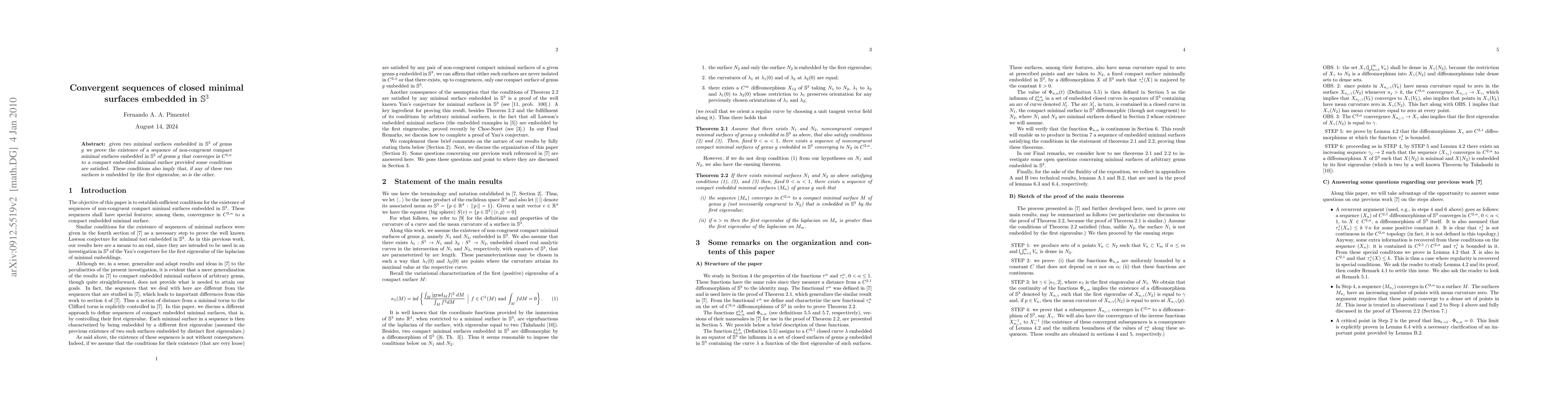 Researchers prove that given two minimal surfaces in 3D space, there exists a sequence of non-congruent compact minimal surfaces that converge to another minimal surface under certain conditions.