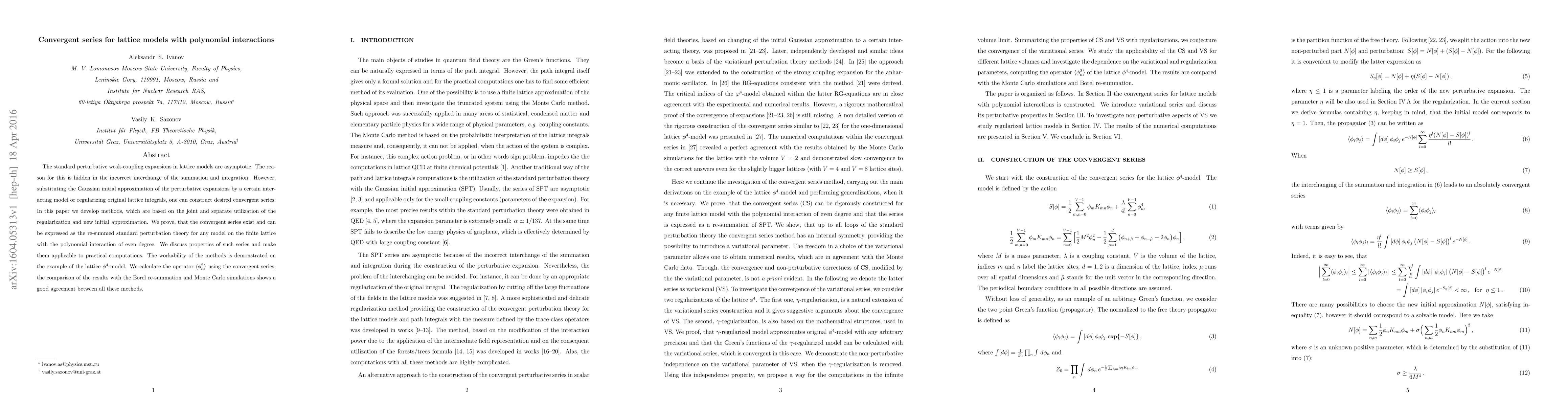 This paper develops methods to construct convergent series for lattice models with polynomial interactions, addressing the issue of asymptotic perturbative expansions. It demonstrates the effectiveness of these methods through the $\phi^4$-model, showing good agreement between the convergent series, Borel re-summation, and Monte Carlo simulations.