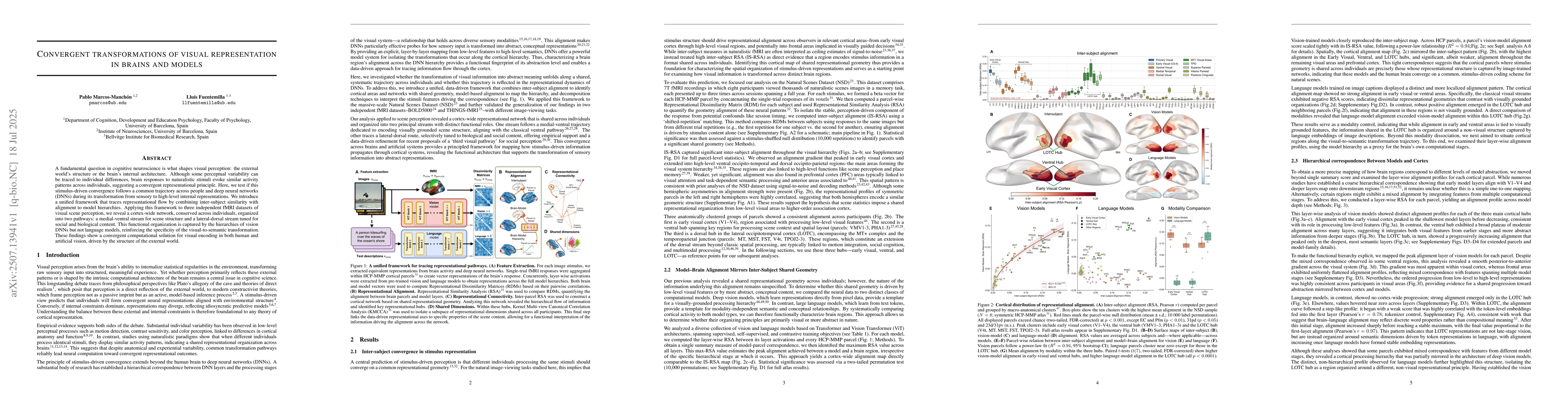 A fundamental question in cognitive neuroscience is what shapes visual perception: the external world's structure or the brain's internal architecture. Although some perceptual variability can be traced to individual differences, brain responses to naturalistic stimuli evoke similar activity patterns across individuals, suggesting a convergent representational principle. Here, we test if this stimulus-driven convergence follows a common trajectory across people and deep neural networks (DNNs) during its transformation from sensory to high-level internal representations. We introduce a unified framework that traces representational flow by combining inter-subject similarity with alignment to model hierarchies. Applying this framework to three independent fMRI datasets of visual scene perception, we reveal a cortex-wide network, conserved across individuals, organized into two pathways: a medial-ventral stream for scene structure and a lateral-dorsal stream tuned for social and biological content. This functional organization is captured by the hierarchies of vision DNNs but not language models, reinforcing the specificity of the visual-to-semantic transformation. These findings show a convergent computational solution for visual encoding in both human and artificial vision, driven by the structure of the external world.
