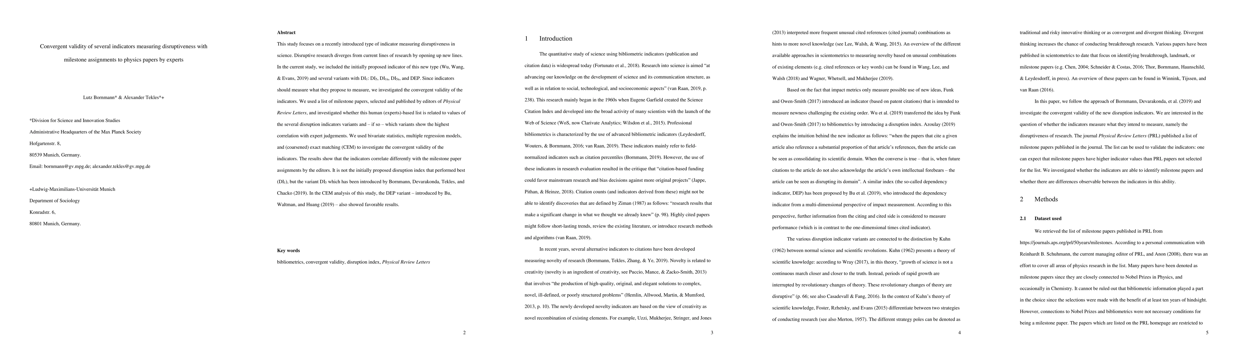 This study investigates the convergent validity of several disruption indicators against expert-selected milestone papers in physics, finding that DI5 and DEP variants correlate best with expert judgements, rather than the initially proposed DI1.