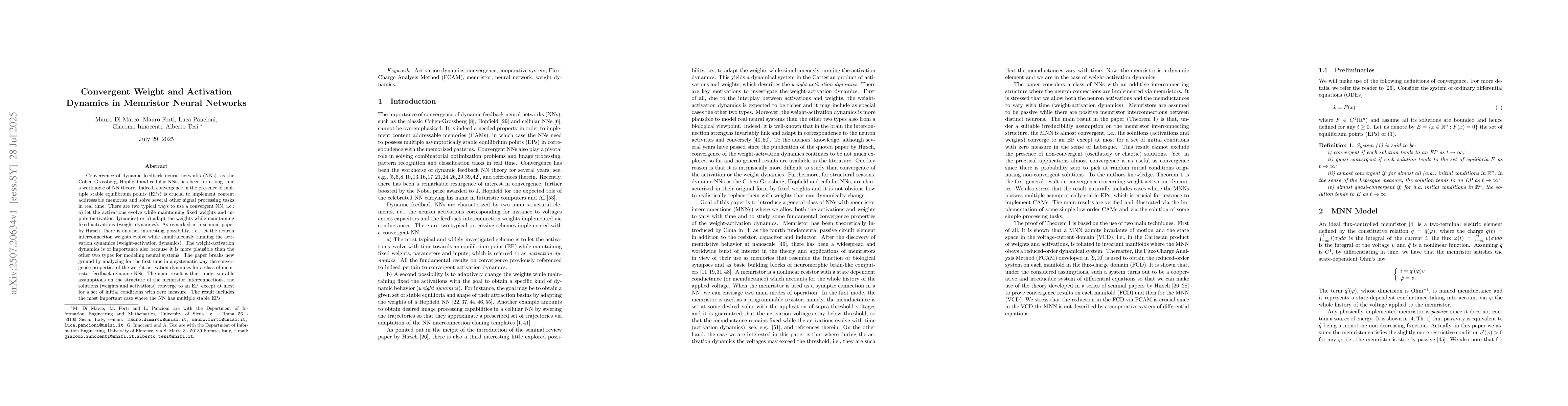 Convergence of dynamic feedback neural networks (NNs), as the Cohen-Grossberg, Hopfield and cellular NNs, has been for a long time a workhorse of NN theory. Indeed, convergence in the presence of multiple stable equilibrium points (EPs) is crucial to implement content addressable memories and solve several other signal processing tasks in real time. There are two typical ways to use a convergent NN, i.e.: a) let the activations evolve while maintaining fixed weights and inputs (activation dynamics) or b) adapt the weights while maintaining fixed activations (weight dynamics). As remarked in a seminal paper by Hirsch, there is another interesting possibility, i.e., let the neuron interconnection weights evolve while simultaneously running the activation dynamics (weight-activation dynamics). The weight-activation dynamics is of importance also because it is more plausible than the other two types for modeling neural systems. The paper breaks new ground by analyzing for the first time in a systematic way the convergence properties of the weight-activation dynamics for a class of memristor feedback dynamic NNs. The main result is that, under suitable assumptions on the structure of the memristor interconnections, the solutions (weights and activations) converge to an EP, except at most for a set of initial conditions with zero measure. The result includes the most important case where the NN has multiple stable EPs.