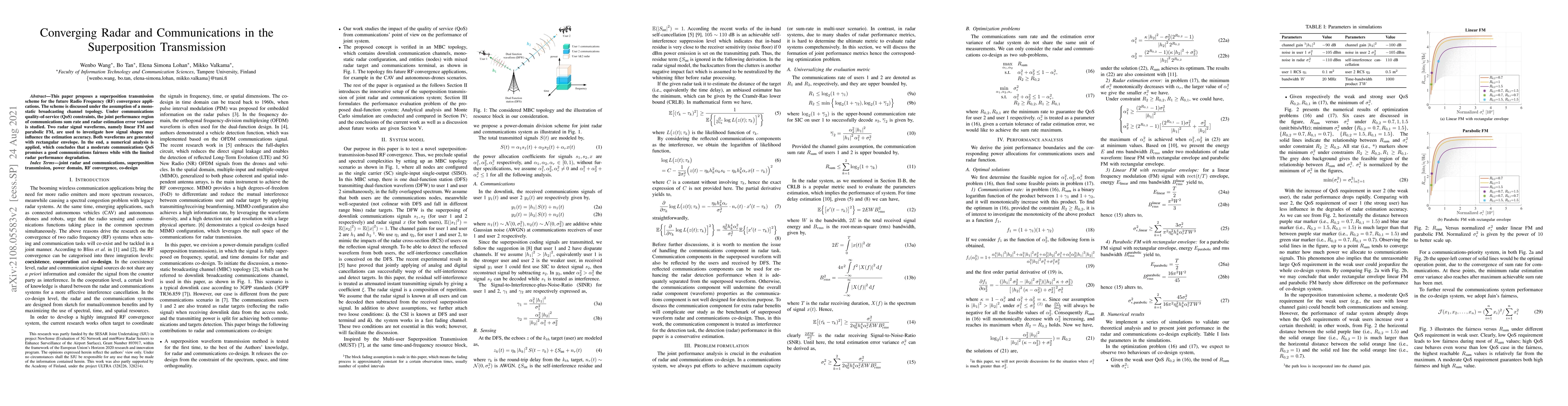 This paper proposes a superposition transmission scheme for the future Radio Frequency (RF) convergence applications. The scheme is discussed under the assumption of a mono-static broadcasting channel topology. Under communications quality-of-service (QoS) constraints, the joint performance region of communications sum rate and radar estimation error variance is studied. Two radar signal waveforms, namely linear FM and parabolic FM, are used to investigate how signal shapes may influence the estimation accuracy. Both waveforms are generated with rectangular envelope. In the end, a numerical analysis is applied, which concludes that a moderate communications QoS promises a good communications fairness while with the limited radar performance degradation.