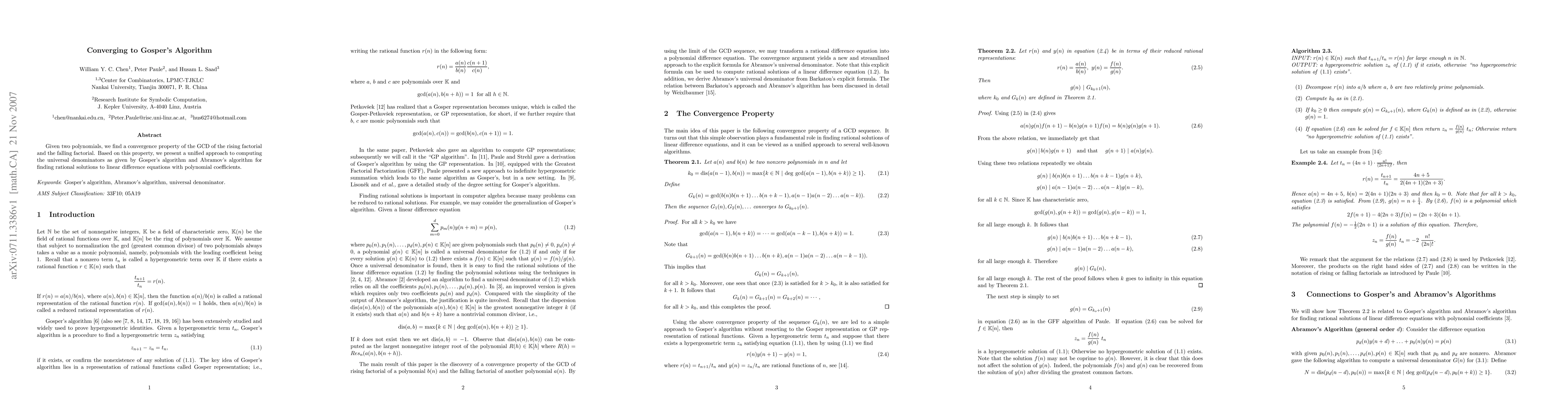 Given two polynomials, we find a convergence property of the GCD of the rising factorial and the falling factorial. Based on this property, we present a unified approach to computing the universal denominators as given by Gosper's algorithm and Abramov's algorithm for finding rational solutions to linear difference equations with polynomial coefficients.
