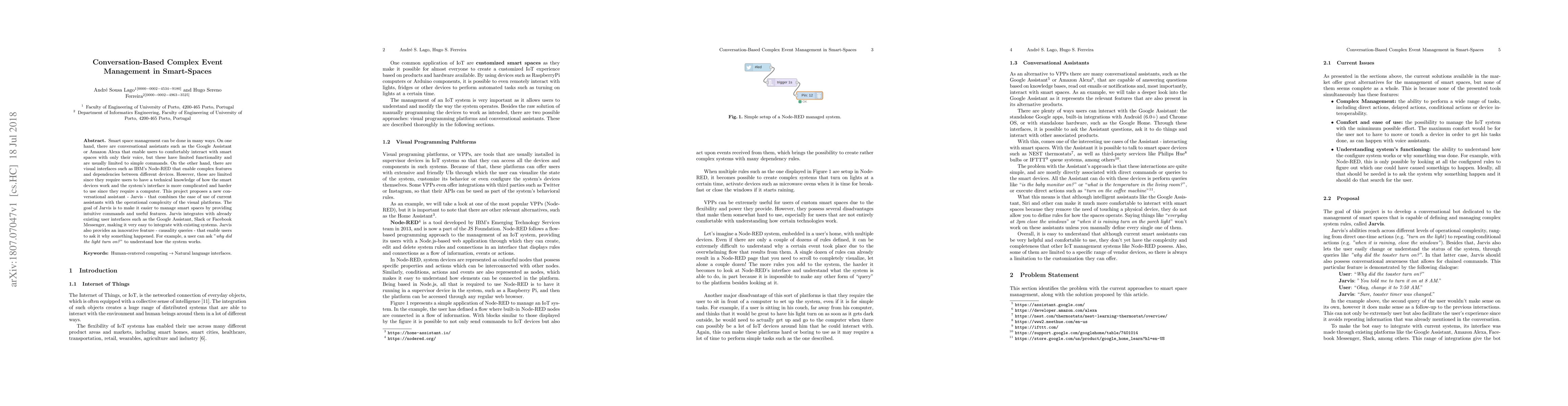 Smart space management can be done in many ways. On one hand, there are conversational assistants such as the Google Assistant or Amazon Alexa that enable users to comfortably interact with smart spaces with only their voice, but these have limited functionality and are usually limited to simple commands. On the other hand, there are visual interfaces such as IBM's Node-RED that enable complex features and dependencies between different devices. However, these are limited since they require users to have a technical knowledge of how the smart devices work and the system's interface is more complicated and harder to use since they require a computer. This project proposes a new conversational assistant - Jarvis - that combines the ease of use of current assistants with the operational complexity of the visual platforms. The goal of Jarvis is to make it easier to manage smart spaces by providing intuitive commands and useful features. Jarvis integrates with already existing user interfaces such as the Google Assistant, Slack or Facebook Messenger, making it very easy to integrate with existing systems. Jarvis also provides an innovative feature - causality queries - that enable users to ask it why something happened. For example, a user can ask "why did the light turn on?" to understand how the system works.