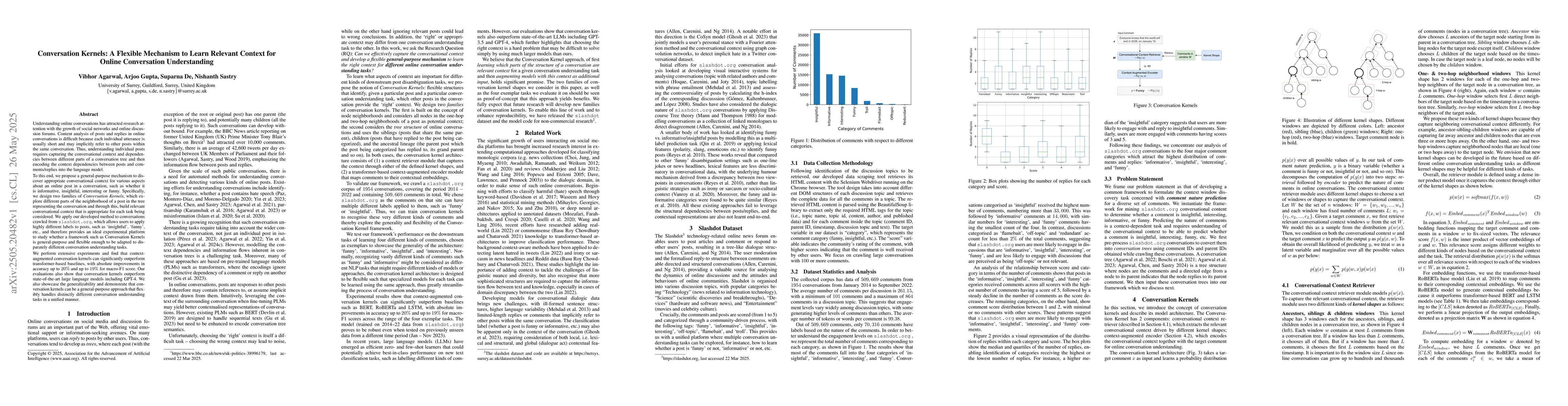 This research introduces Conversation Kernels, a flexible mechanism to identify relevant context in online conversations. By exploring different neighborhood parts of a post in a conversation tree, it builds task-appropriate context for analyzing posts' aspects like informative, insightful, interesting, or funny. The method is tested on Slashdot.org conversations, demonstrating its adaptability to diverse conversation understanding tasks.