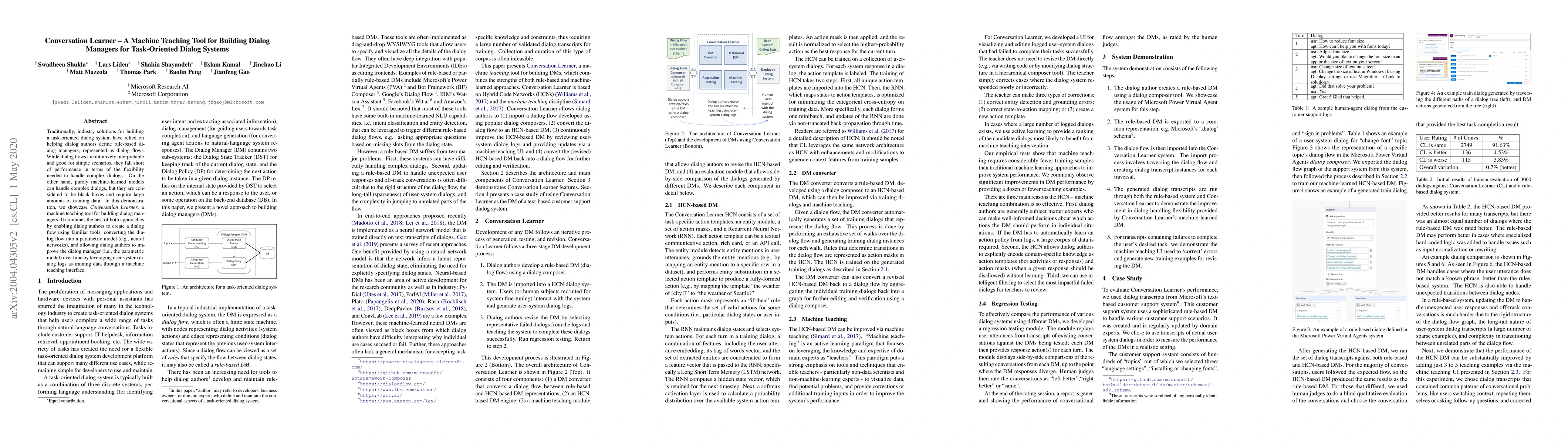The paper introduces Conversation Learner, a machine teaching tool that bridges the gap between rule-based and purely machine-learned dialog systems by enabling authors to create and refine dialog flows into parametric models, improving performance through user interaction logs. This approach aims to enhance flexibility and reduce the need for extensive training data.