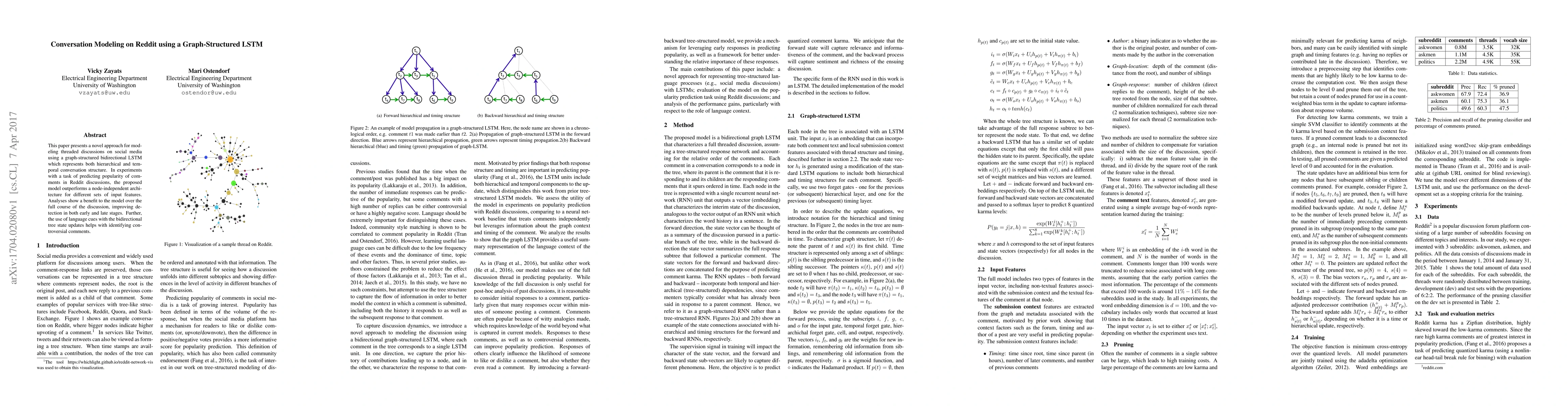 A novel approach is presented for modeling threaded discussions on social media using a graph-structured bidirectional LSTM, which represents both hierarchical and temporal conversation structure.
