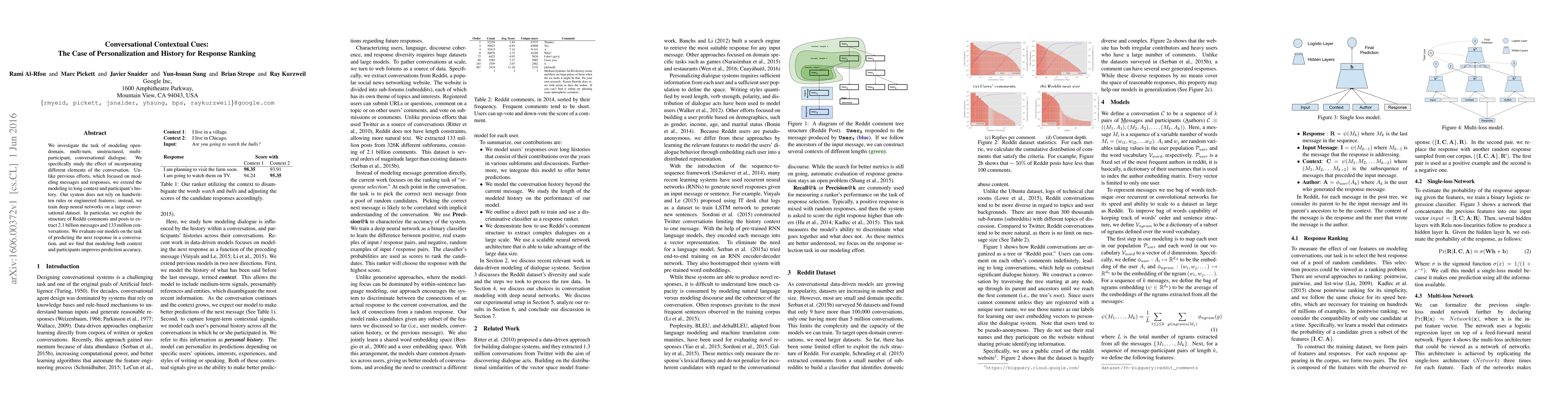 This paper explores the use of deep neural networks to model multi-turn, multi-participant conversational dialogues, focusing on incorporating context and participants' history for response ranking. The authors train their models on a large dataset extracted from Reddit, demonstrating improved prediction accuracy by considering both conversational context and participant history.