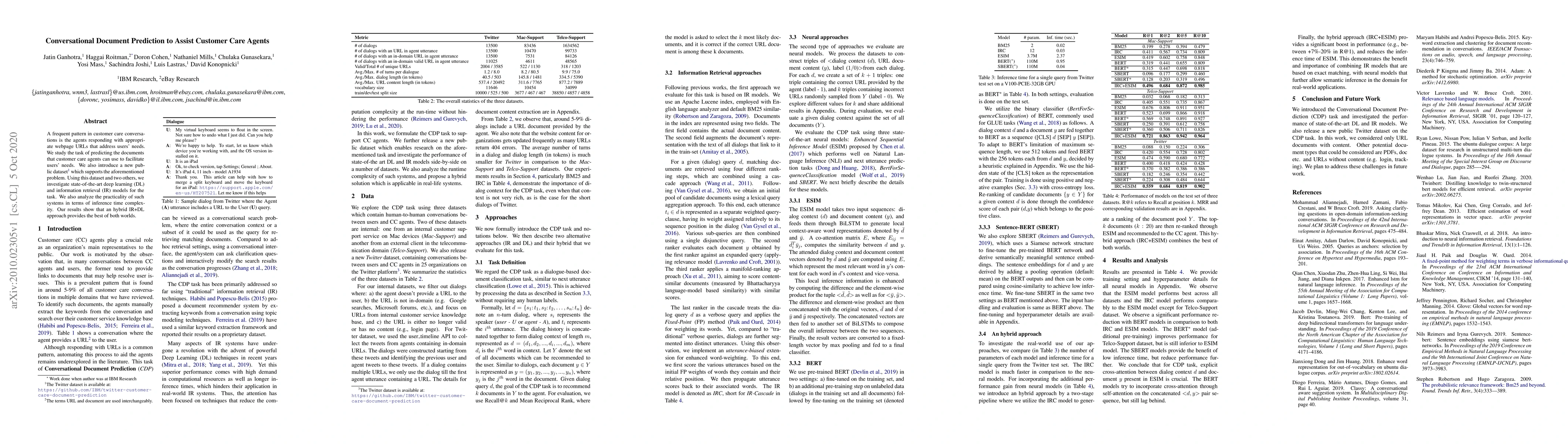 This paper explores predicting documents to assist customer care agents by introducing a new dataset and evaluating deep learning and information retrieval models. An hybrid approach combining IR and DL is found to be most effective, balancing performance and inference time.
