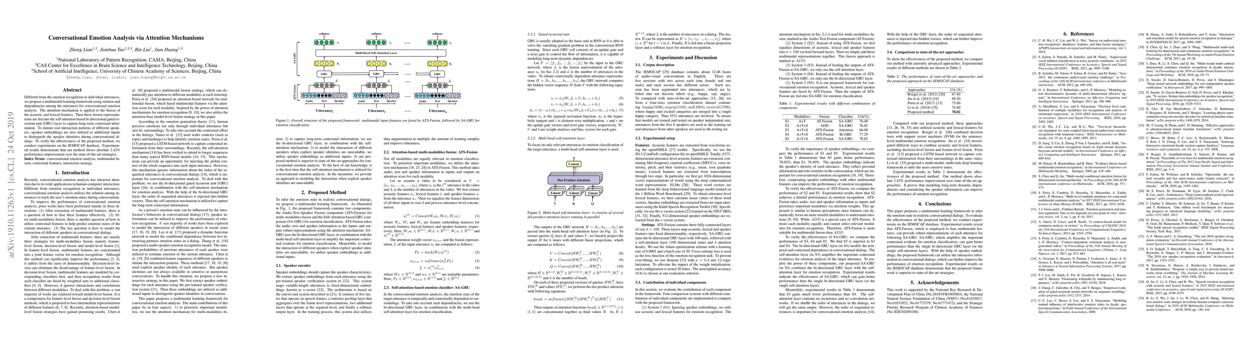 This paper proposes a multimodal learning framework for conversational emotion analysis using attention mechanisms to fuse acoustic and lexical features, incorporating a self-attention based bi-directional GRU layer and speaker embeddings. Experiments on the IEMOCAP database show a 2.42% improvement over existing methods.