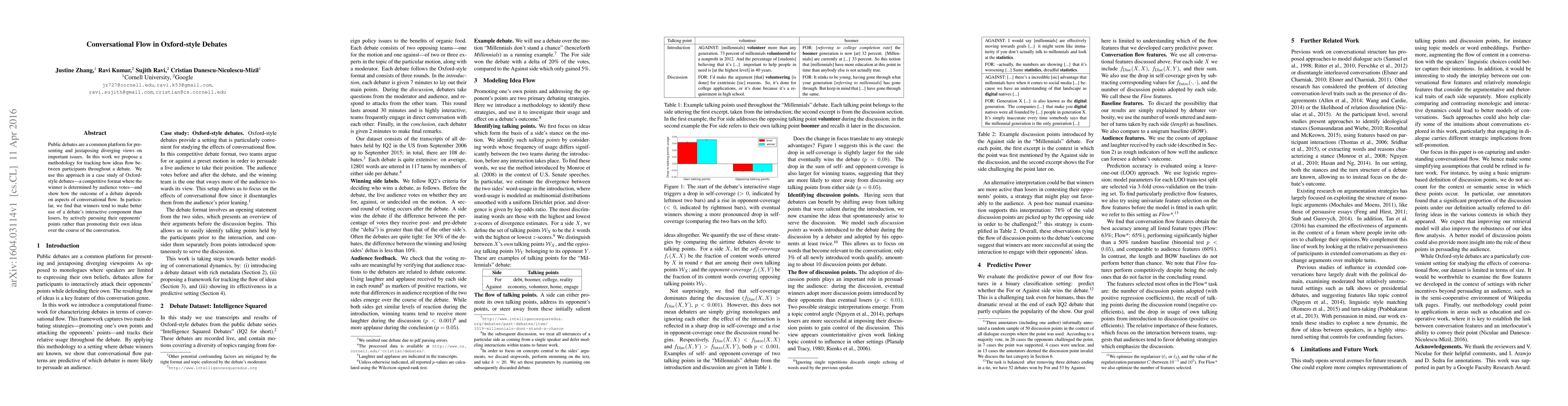 Public debates are a common platform for presenting and juxtaposing diverging views on important issues. In this work we propose a methodology for tracking how ideas flow between participants throughout a debate. We use this approach in a case study of Oxford-style debates---a competitive format where the winner is determined by audience votes---and show how the outcome of a debate depends on aspects of conversational flow. In particular, we find that winners tend to make better use of a debate's interactive component than losers, by actively pursuing their opponents' points rather than promoting their own ideas over the course of the conversation.