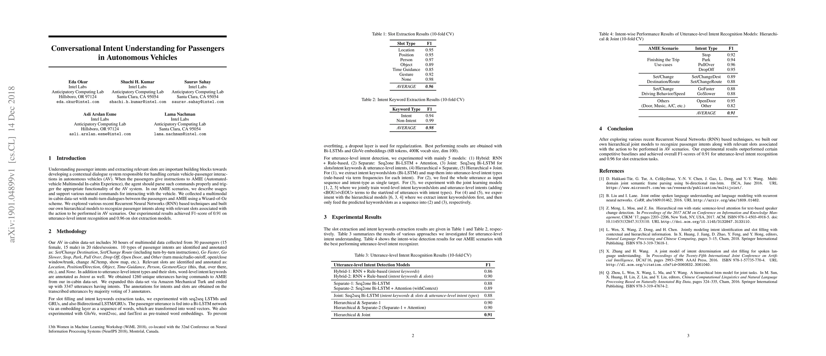 This paper explores intent recognition and slot extraction for passengers in autonomous vehicles using RNN-based techniques and hierarchical models. Experimental results show high accuracy with F1-scores of 0.91 for intent recognition and 0.96 for slot extraction.