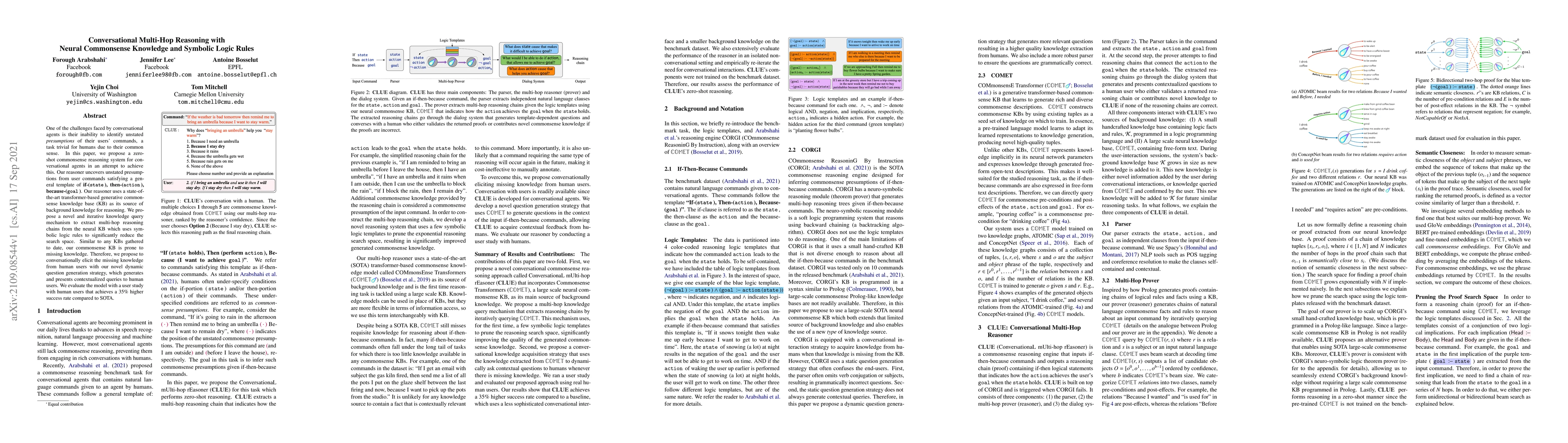 This paper introduces a system for conversational agents that leverages neural commonsense knowledge and symbolic logic rules to perform multi-hop reasoning, uncovering unstated presumptions in user commands. The system dynamically queries users for missing knowledge and achieves a 35% higher success rate than current state-of-the-art methods, as demonstrated in a user study.
