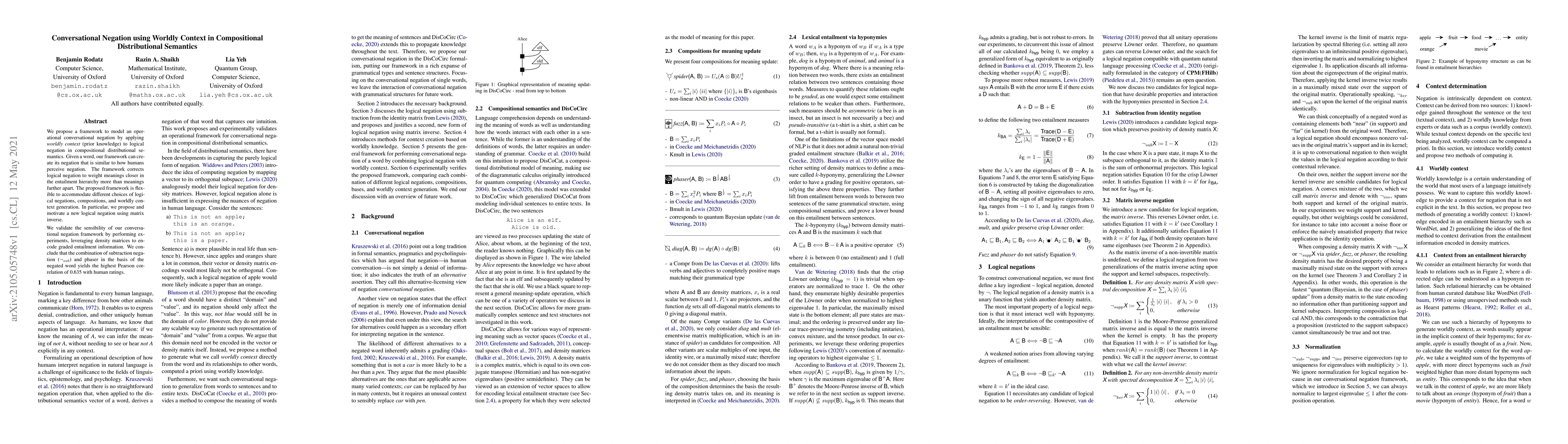 This paper proposes a framework for conversational negation in compositional distributional semantics, utilizing worldly context to model human-like negation. The framework employs matrix inverse for logical negation and achieves a Pearson correlation of 0.635 with human ratings, demonstrating its effectiveness.
